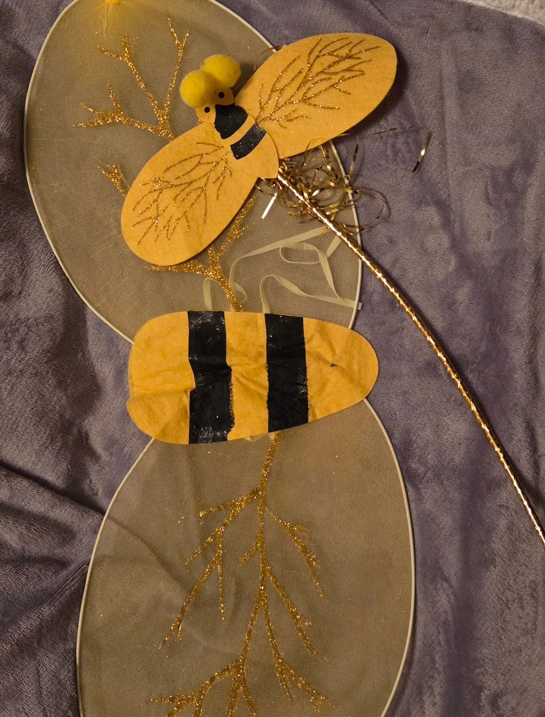 A fun bee costume set including glittery wings, a plush body piece, and antennae headband. Great for dress-up or Halloween! Made from felt and sheer fabric.
