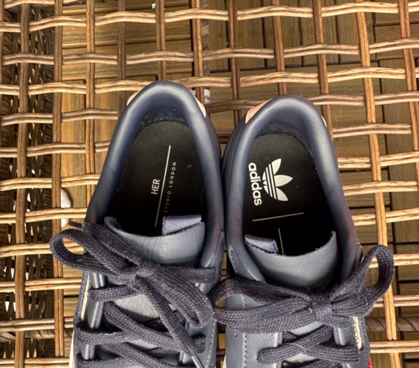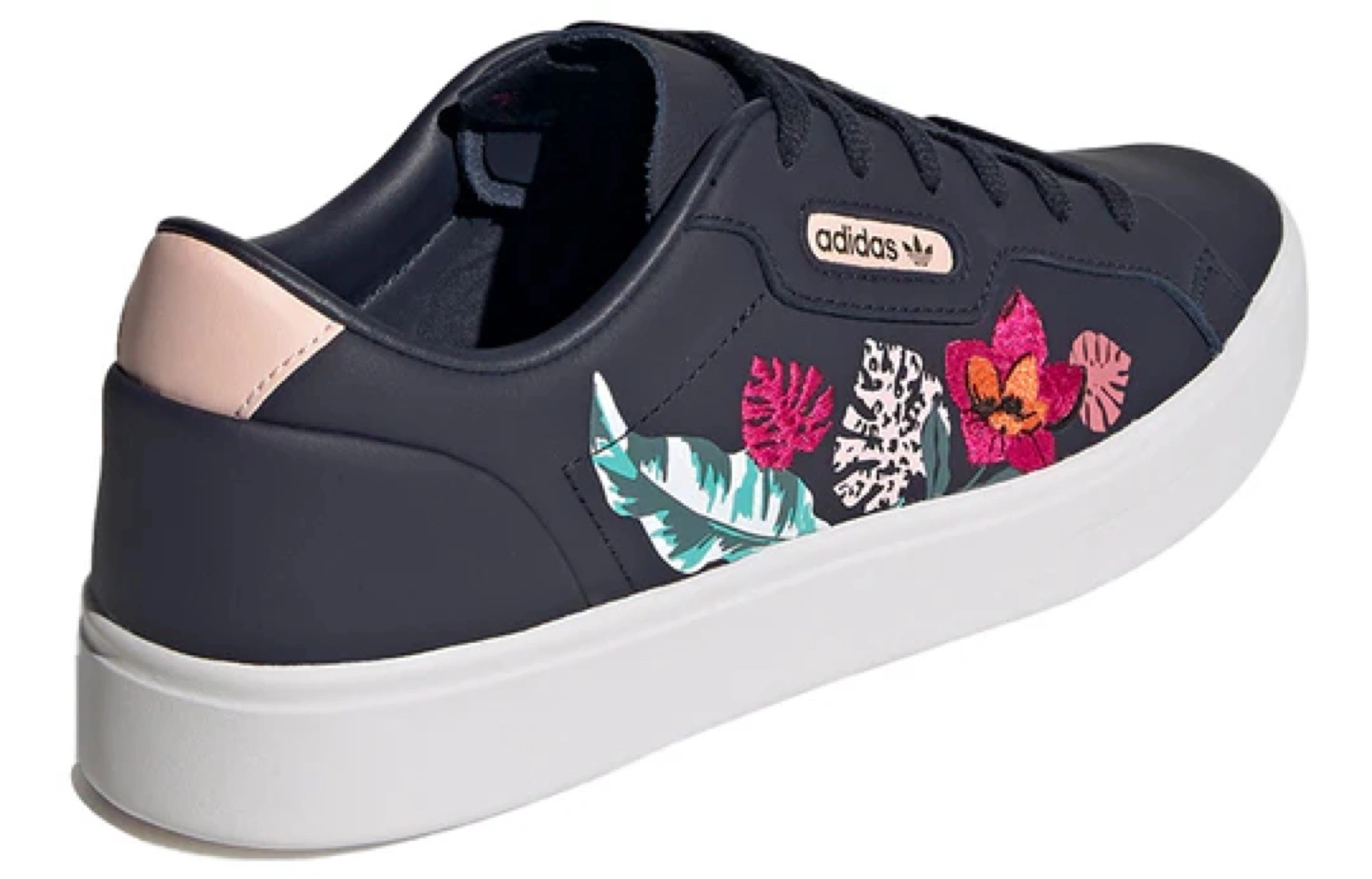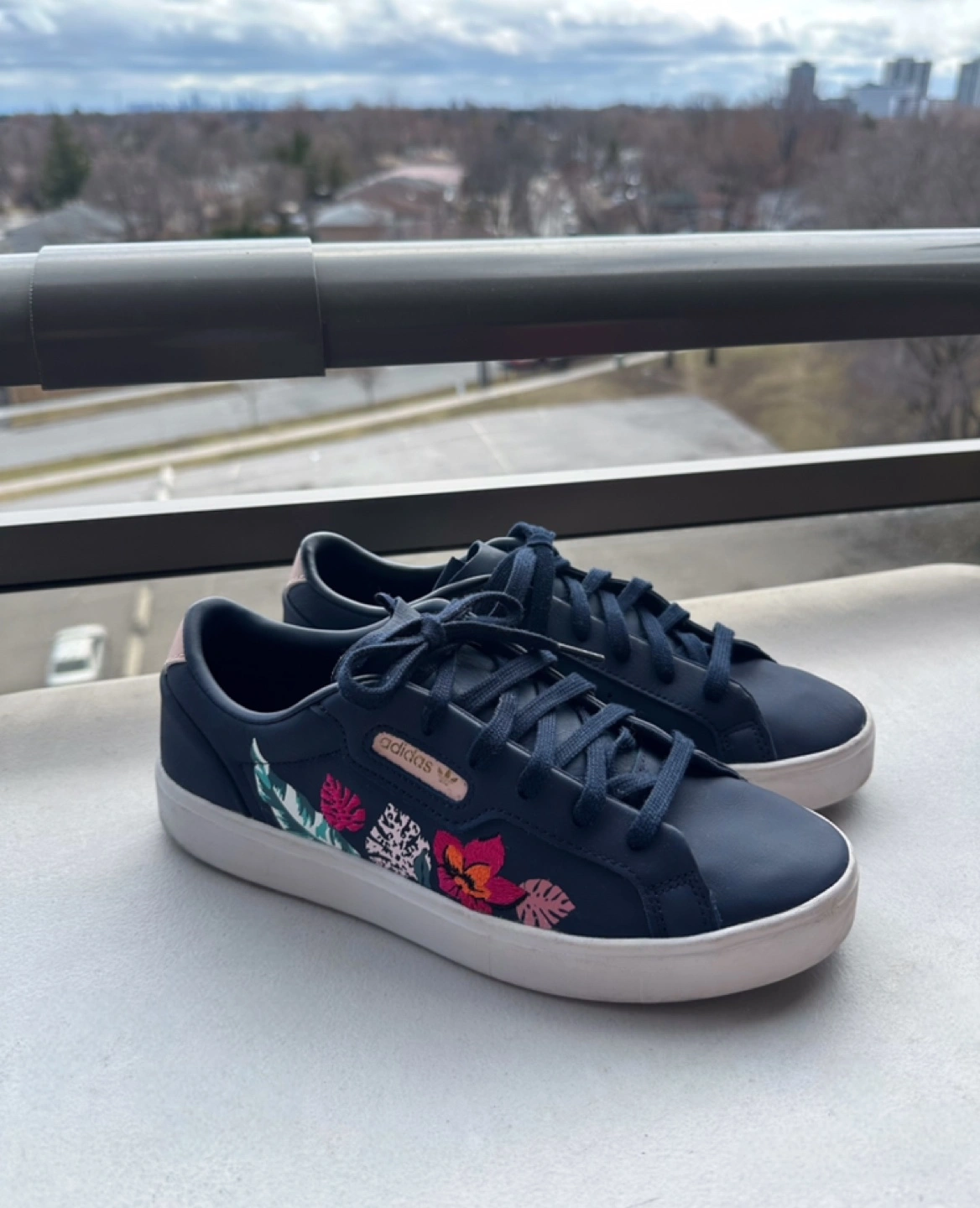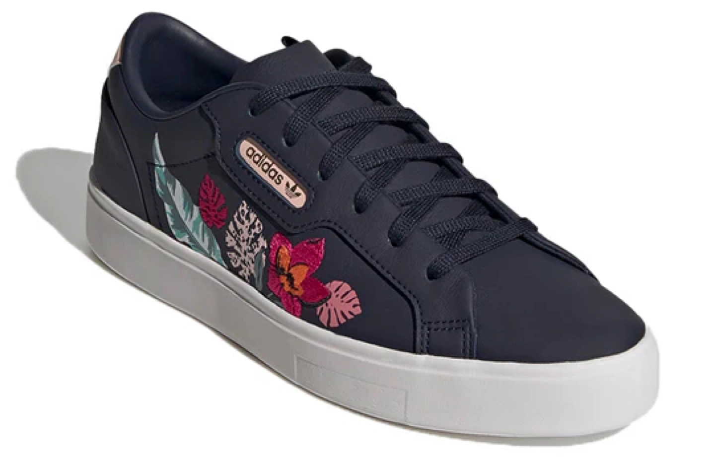 Women's Adidas Sleek sneakers. Navy blue leather upper. Floral embroidery. White platform sole. Lace-up closure. Size 38. In good condition.