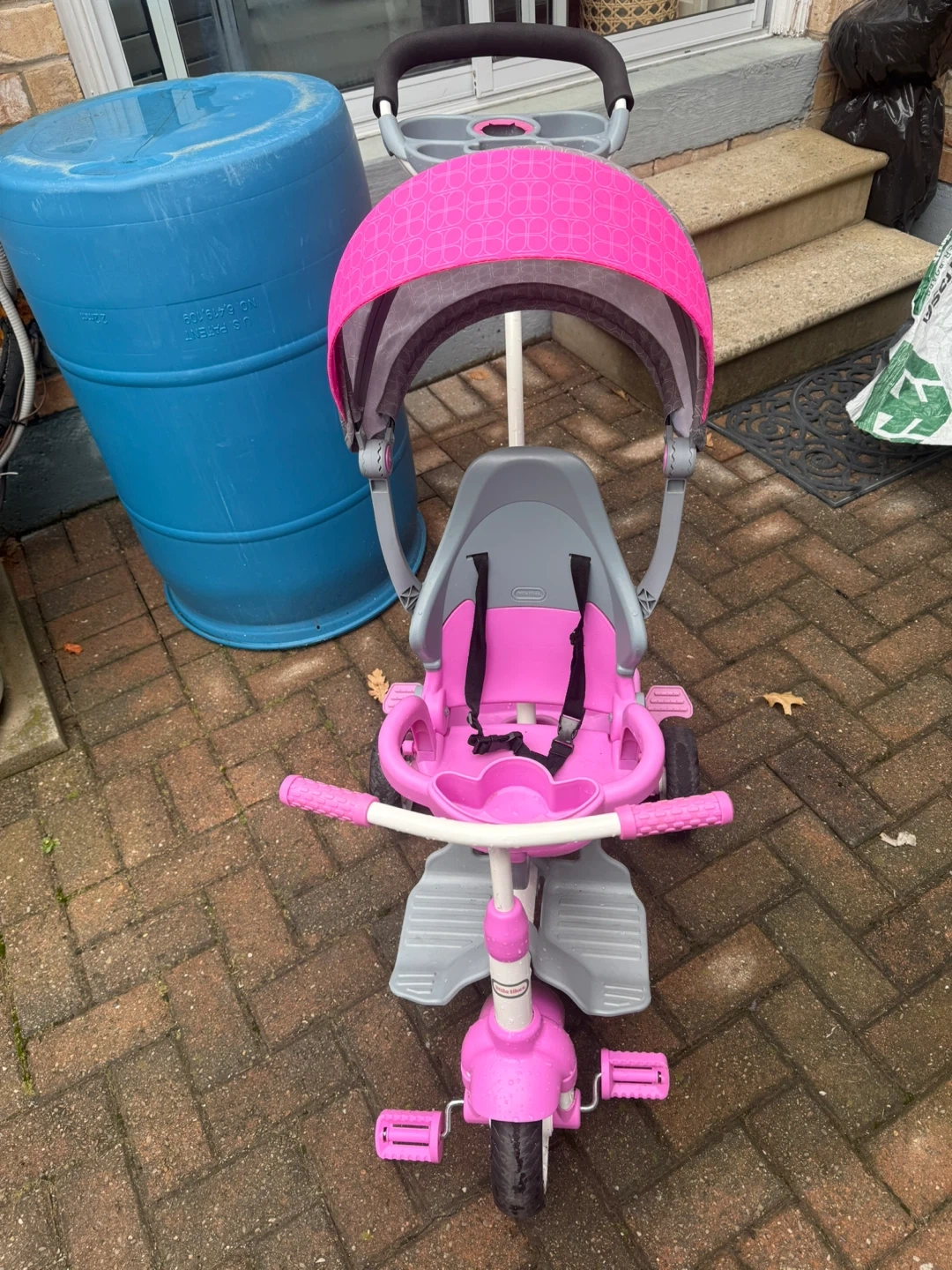 This versatile pink Little Tikes 4-in-1 trike grows with your child, offering multiple stages from stroll to ride. It features a secure safety harness and a convenient parent push handle.