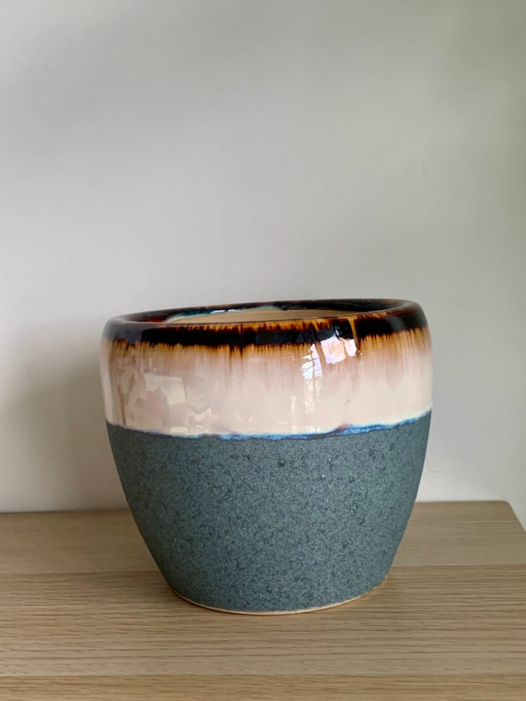 I'm selling a lovely multi-tone handmade ceramic planter! It features a unique glaze with a dark brown rim, a creamy white middle, and a textured blue-grey base. Perfect for adding a touch of style to your plants and home decor. Like new condition.