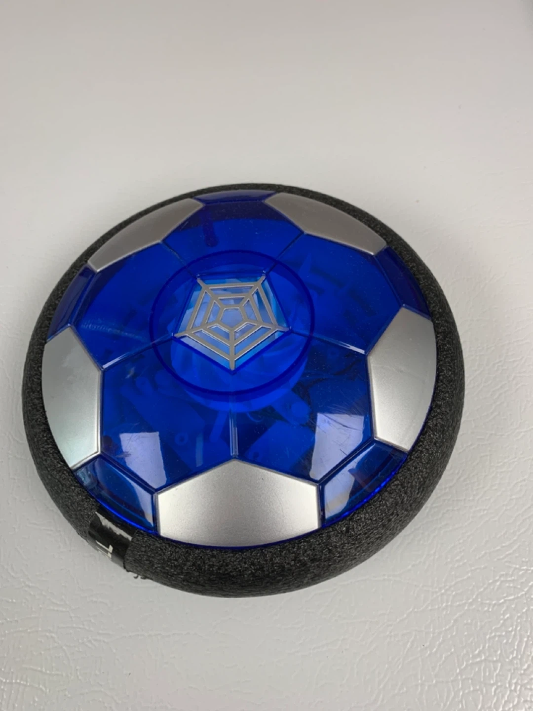 This fun hover soccer ball lights up and glides across surfaces. It's made with a durable plastic and foam bumper for safe play. Great for indoor fun on smooth floors!