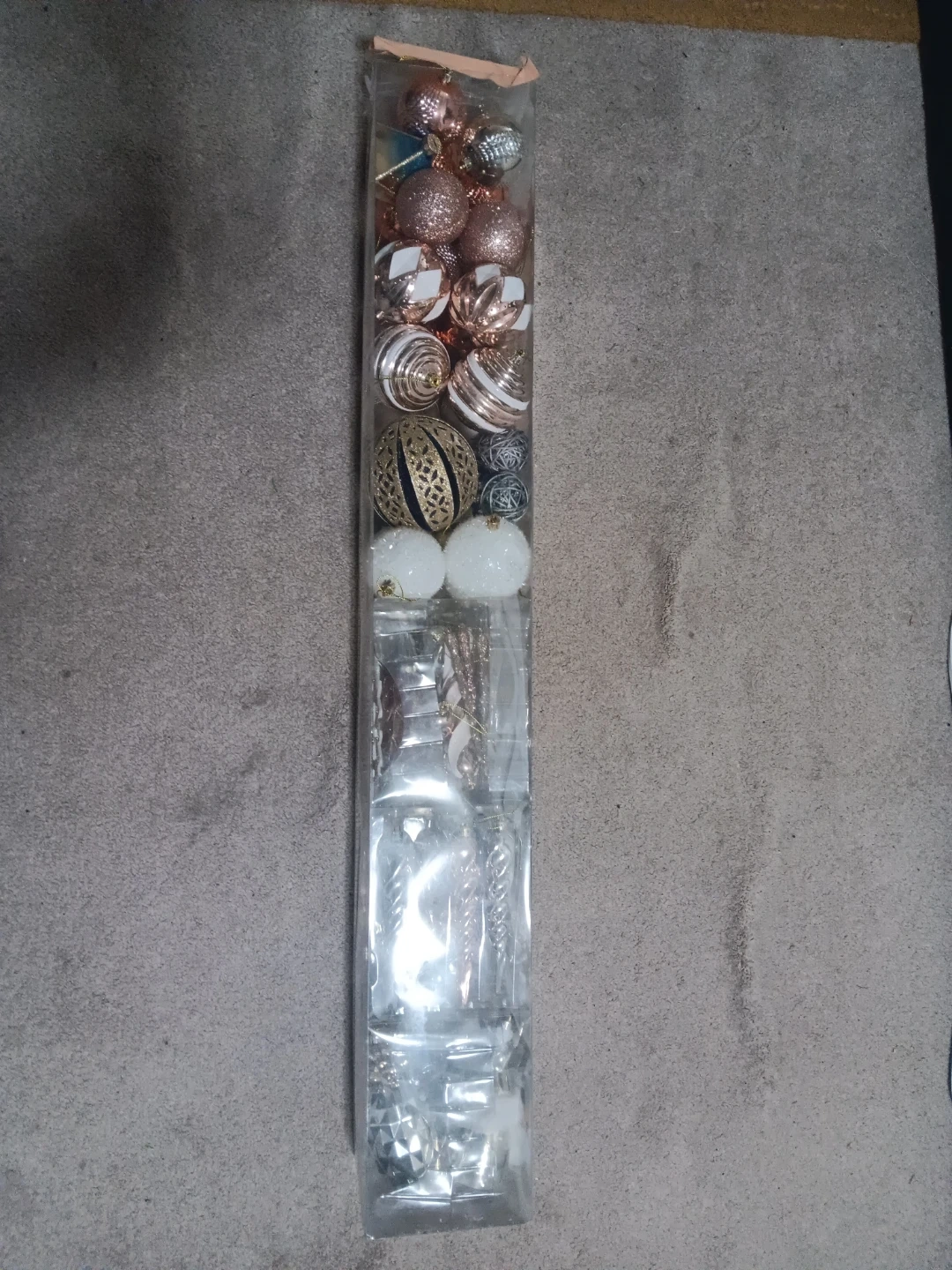 A collection of Christmas ornaments for your tree. Includes various ball and icicle-shaped decorations in metallic and white finishes. Comes in a clear plastic case for storage.
