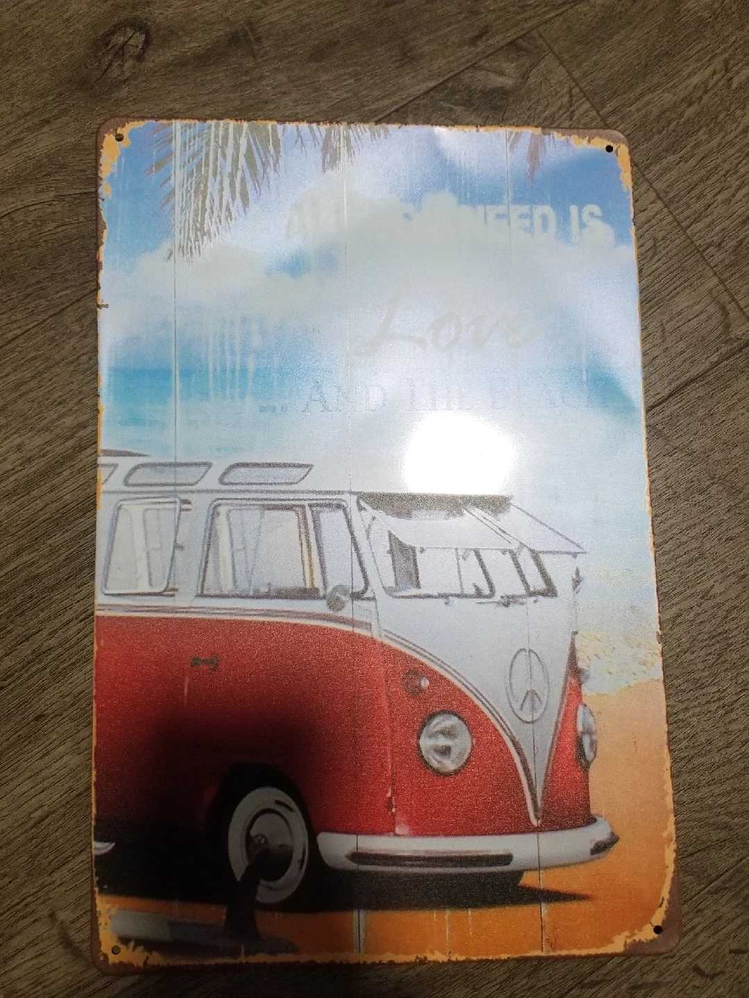 Metal sign featuring a classic VW bus with a beach scene. It says 'All you need is Love and the Beach'. Perfect for adding a touch of summer vibes to any room! Brand new 8x12