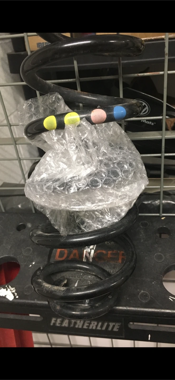 35Selling a coil spring for a VW GTI, part number 1K0511115EC. It fits GTI models from 2008 to 2014. The spring has 1 blue, 1 pink, and 2 yellow marks.