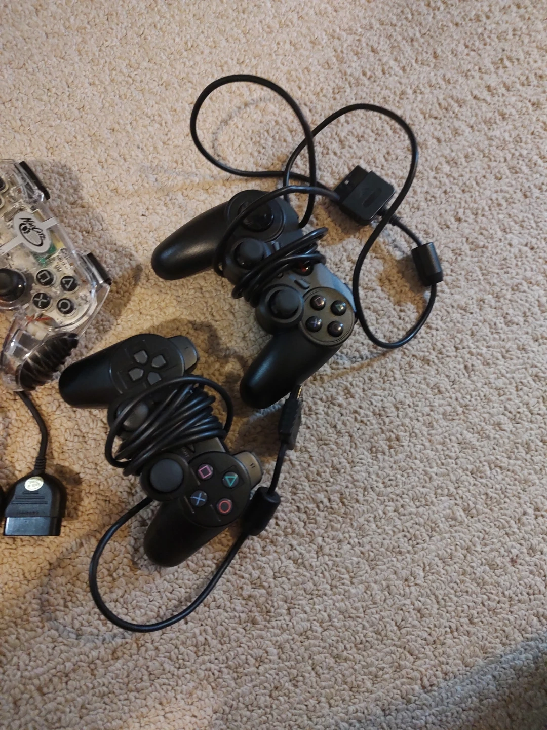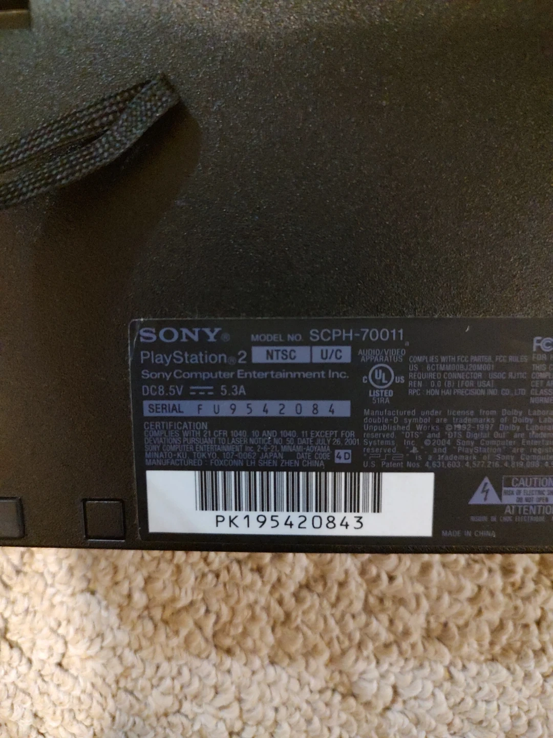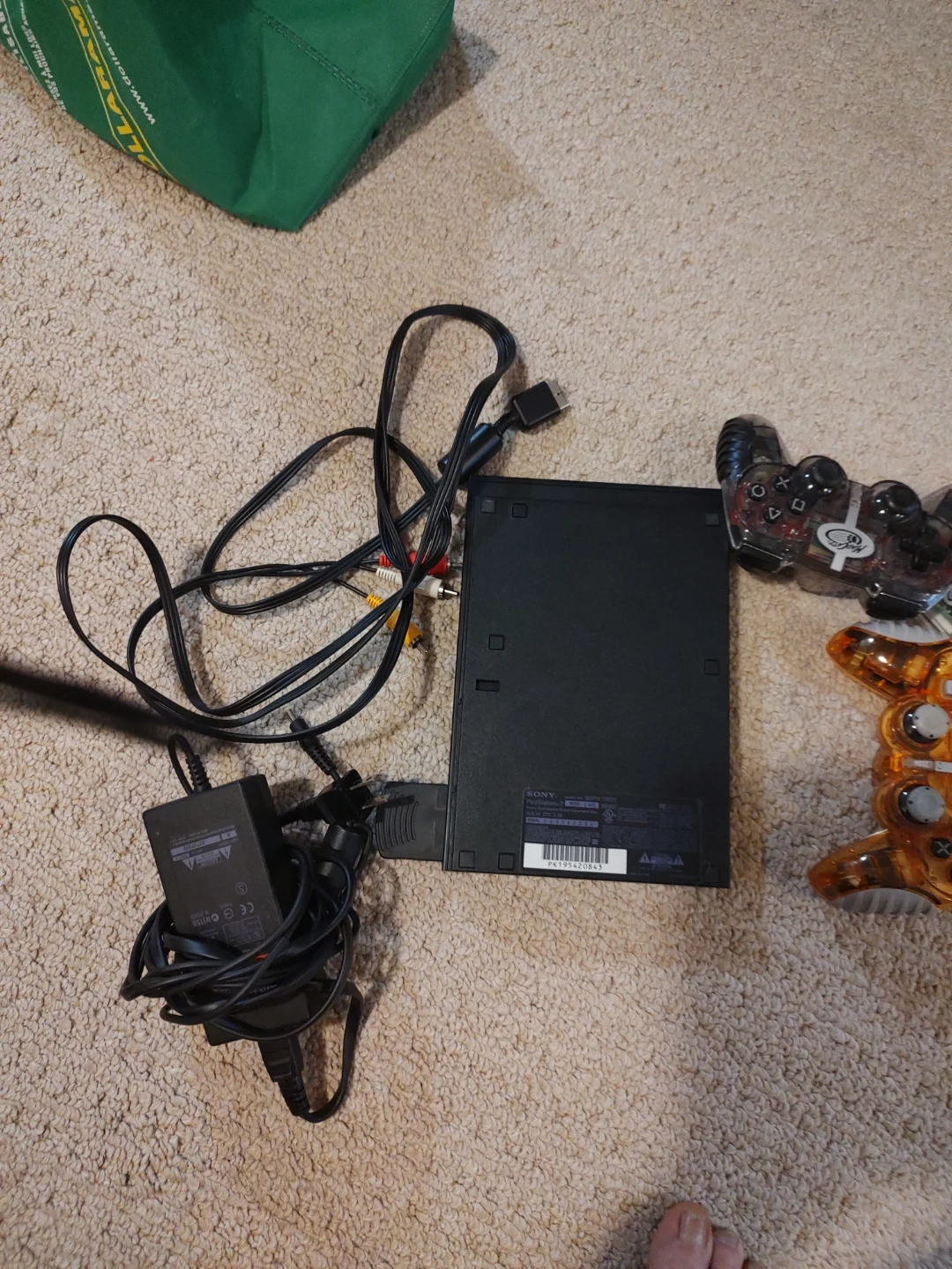 Includes a black PlayStation 2 console, model SCPH-70011. Comes with two black wired DualShock 2 controllers and two clear aftermarket controllers (one black, one orange). Several memory cards and AV cables are also included. It's ready for gaming!