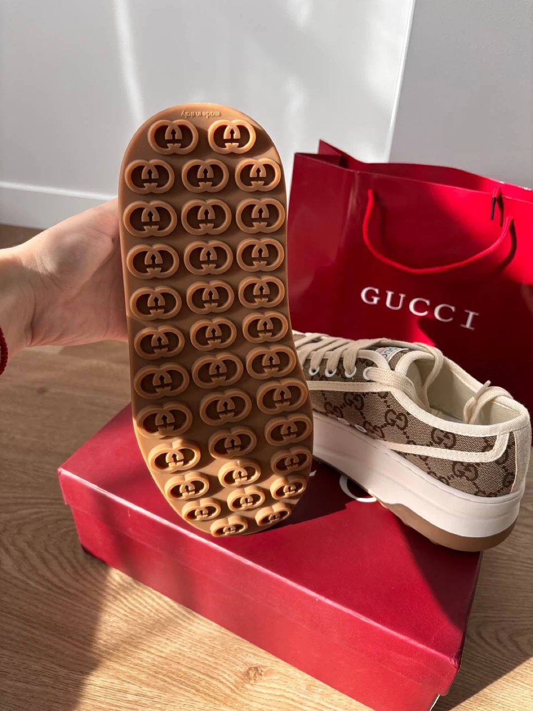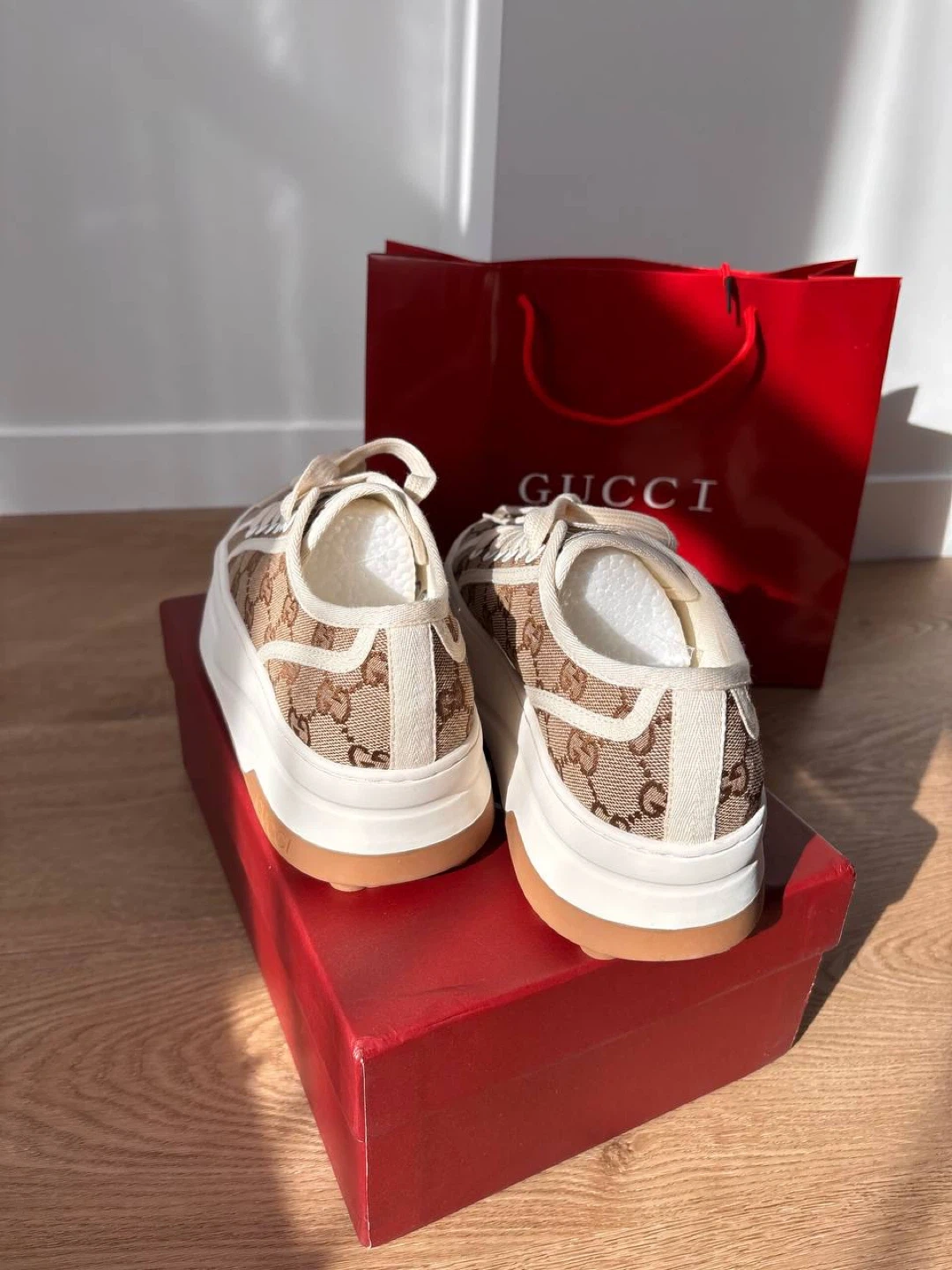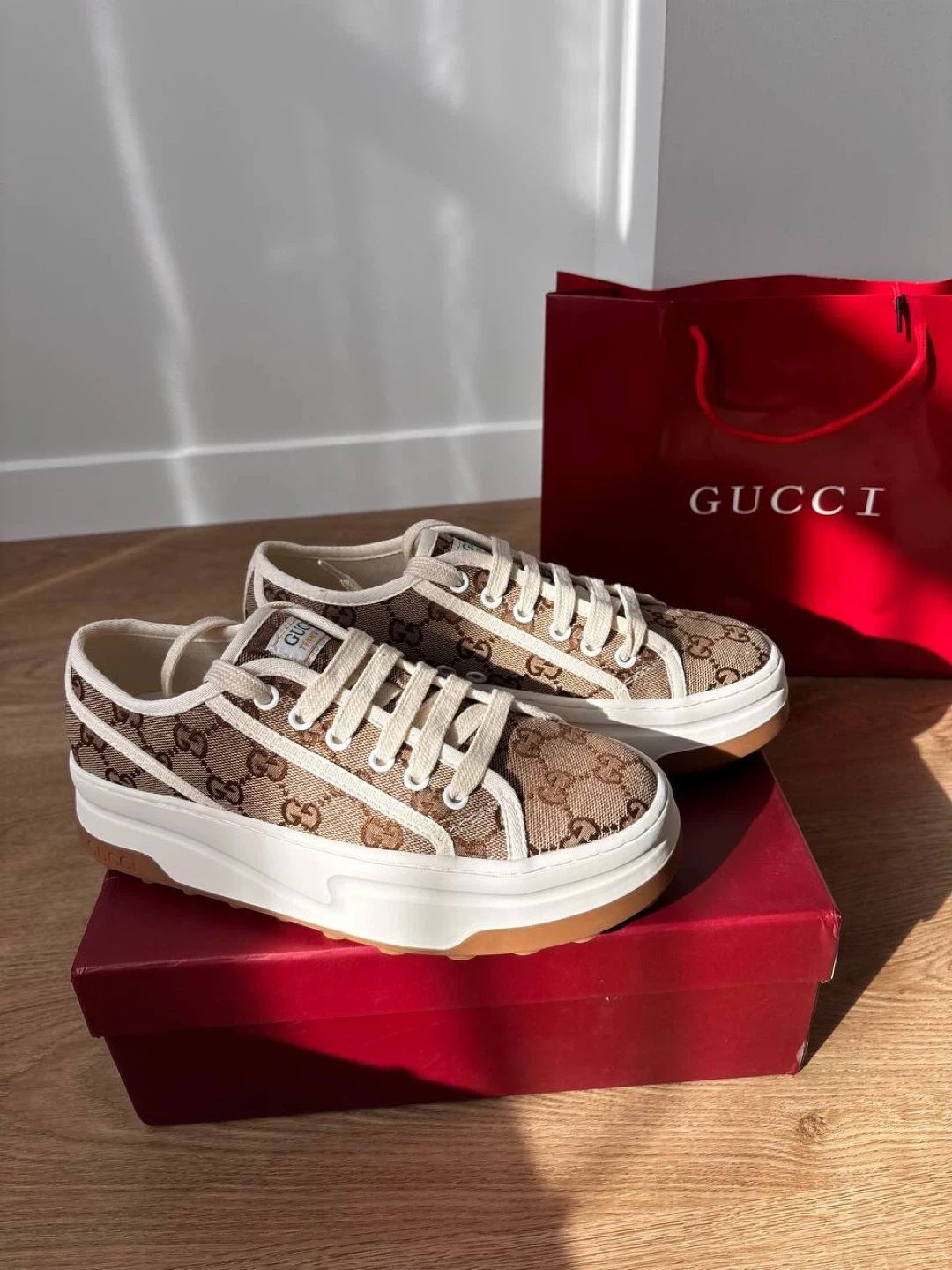 These Gucci GG canvas sneakers come in a classic brown and beige monogram pattern. They feature white laces and a thick white rubber sole with a brown trim. Includes original box .Perfect for everyday wear!