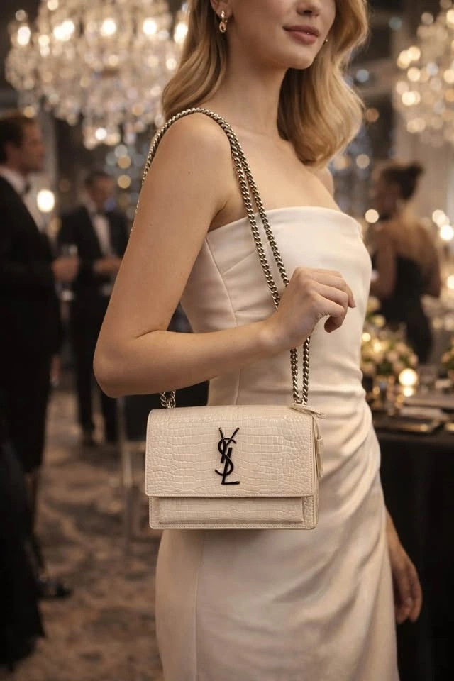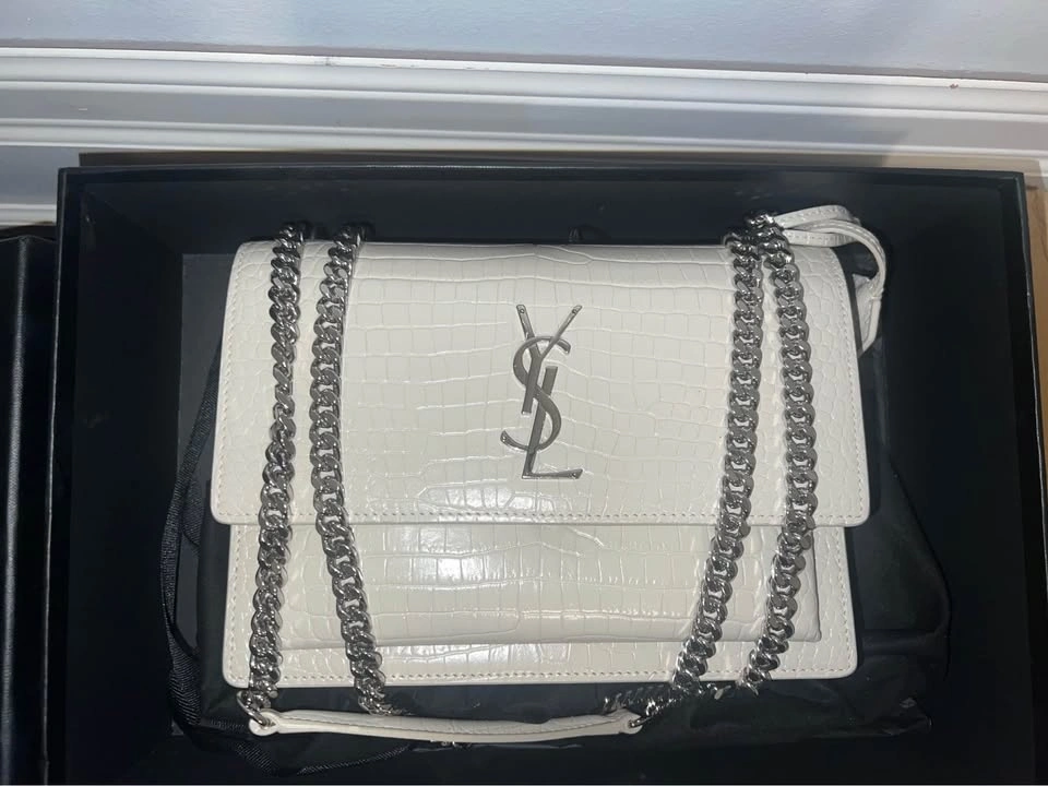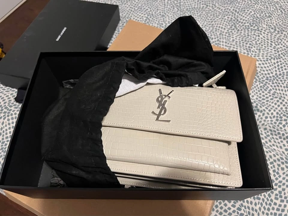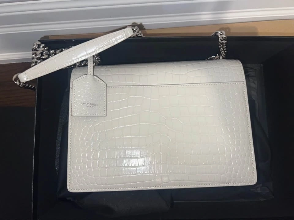 Authentic Saint Laurent Sunset Medium Shoulder Bag. Worn once, absolutely no wear or tear. 100% authentic, purchased at Yorkdale Mall. Includes original receipt, dust bag, and box. This bag has been extremely well cared for and is essentially like new. It’s been sitting in my closet and deserves to be worn and loved. At the time of purchase, there was only one left in North America, making this piece especially rare. Beautiful croc-embossed leather in a stunning neutral shade with silver-tone hardware — perfect for both day and night. Retail: $3,685 CAD + tax ($4,164.05 after tax). Asking: $3800.
