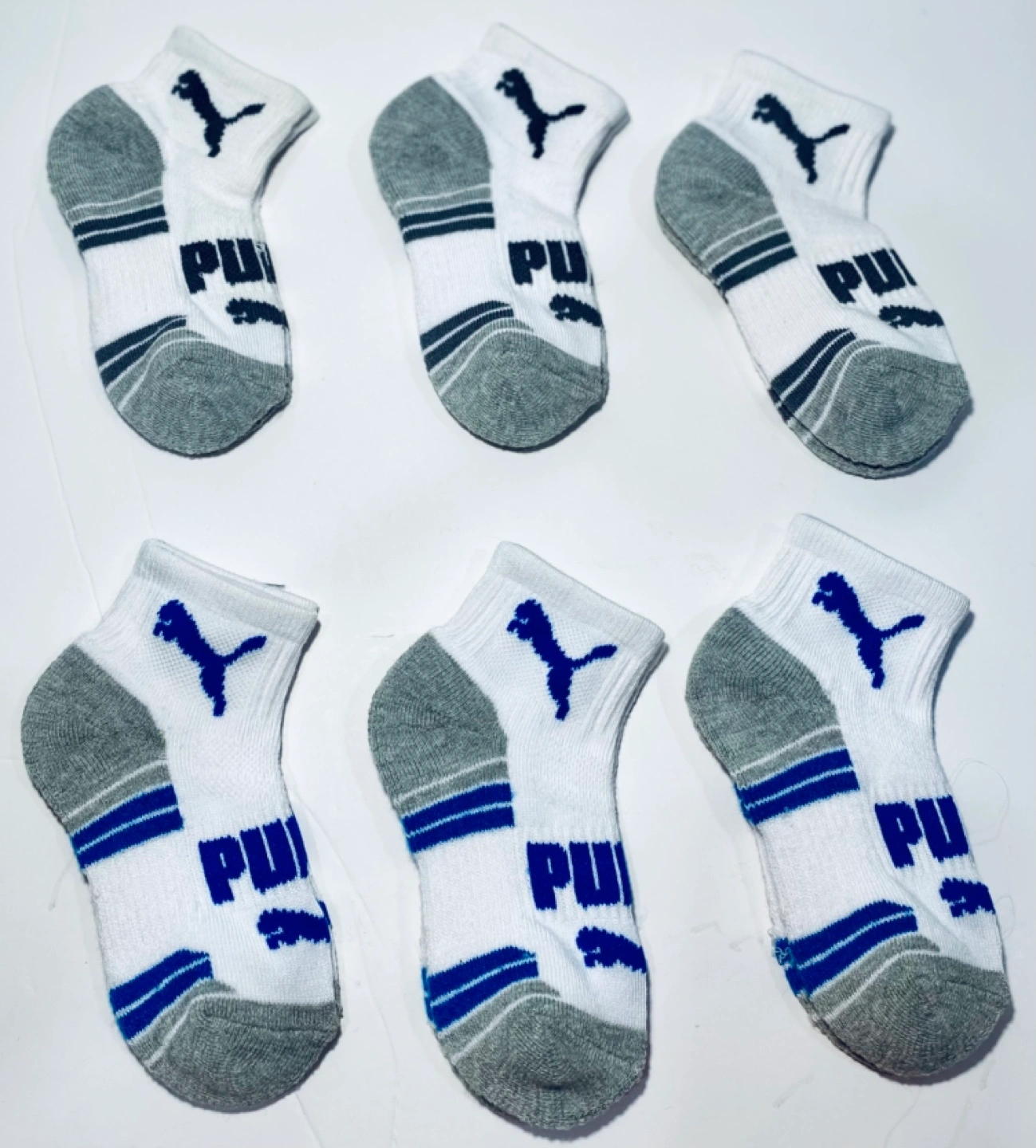 Six pairs of boys ankle socks. White, gray, and blue stripes. Puma logo. Size 5-6.5