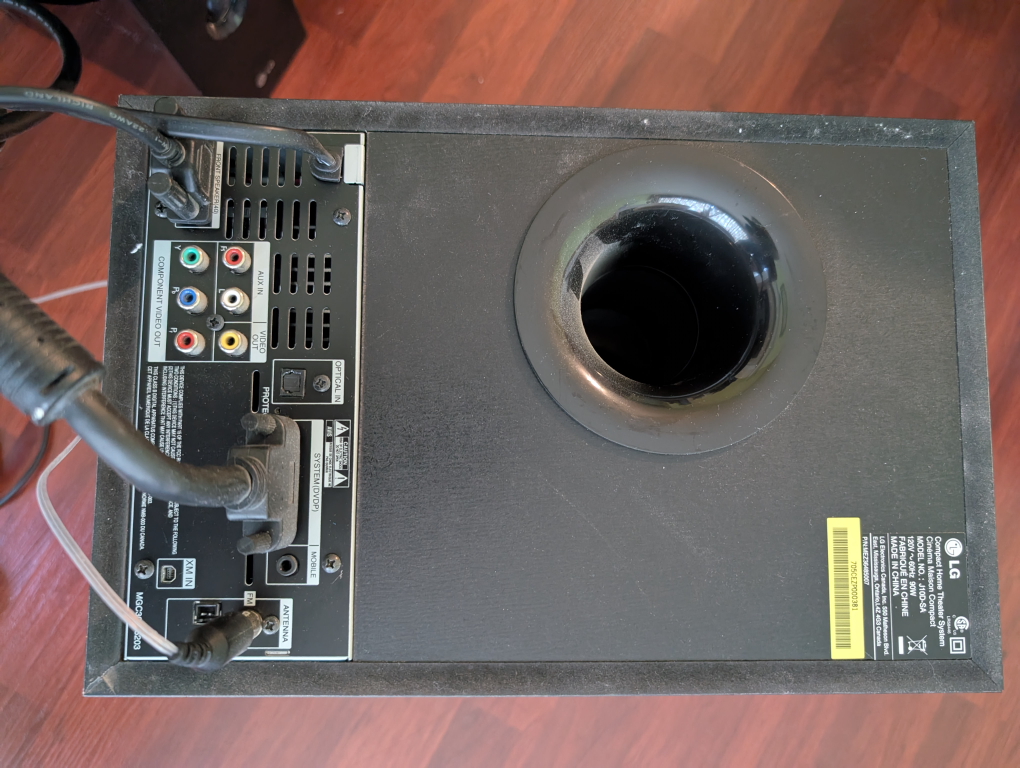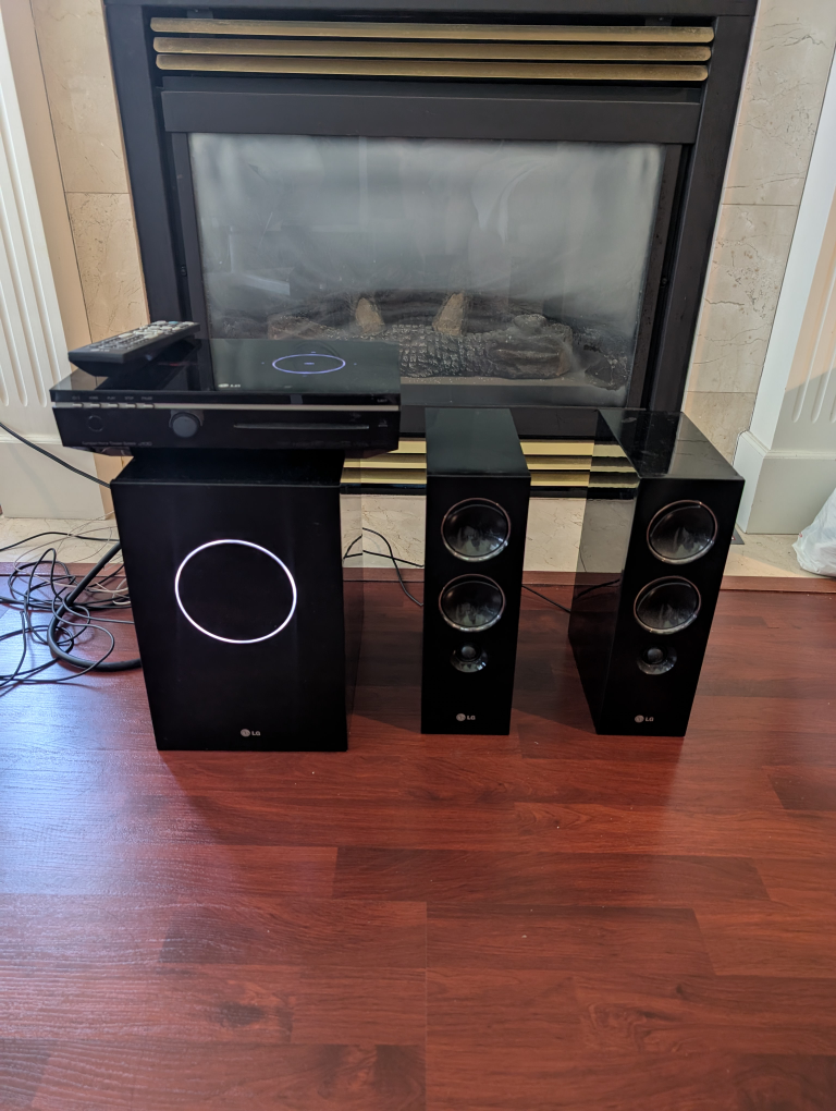Giving away an LG home theatre system. It includes a subwoofer, two speakers, and a main unit. The system is black and comes with a remote control. Perfect for enhancing your home entertainment experience!
