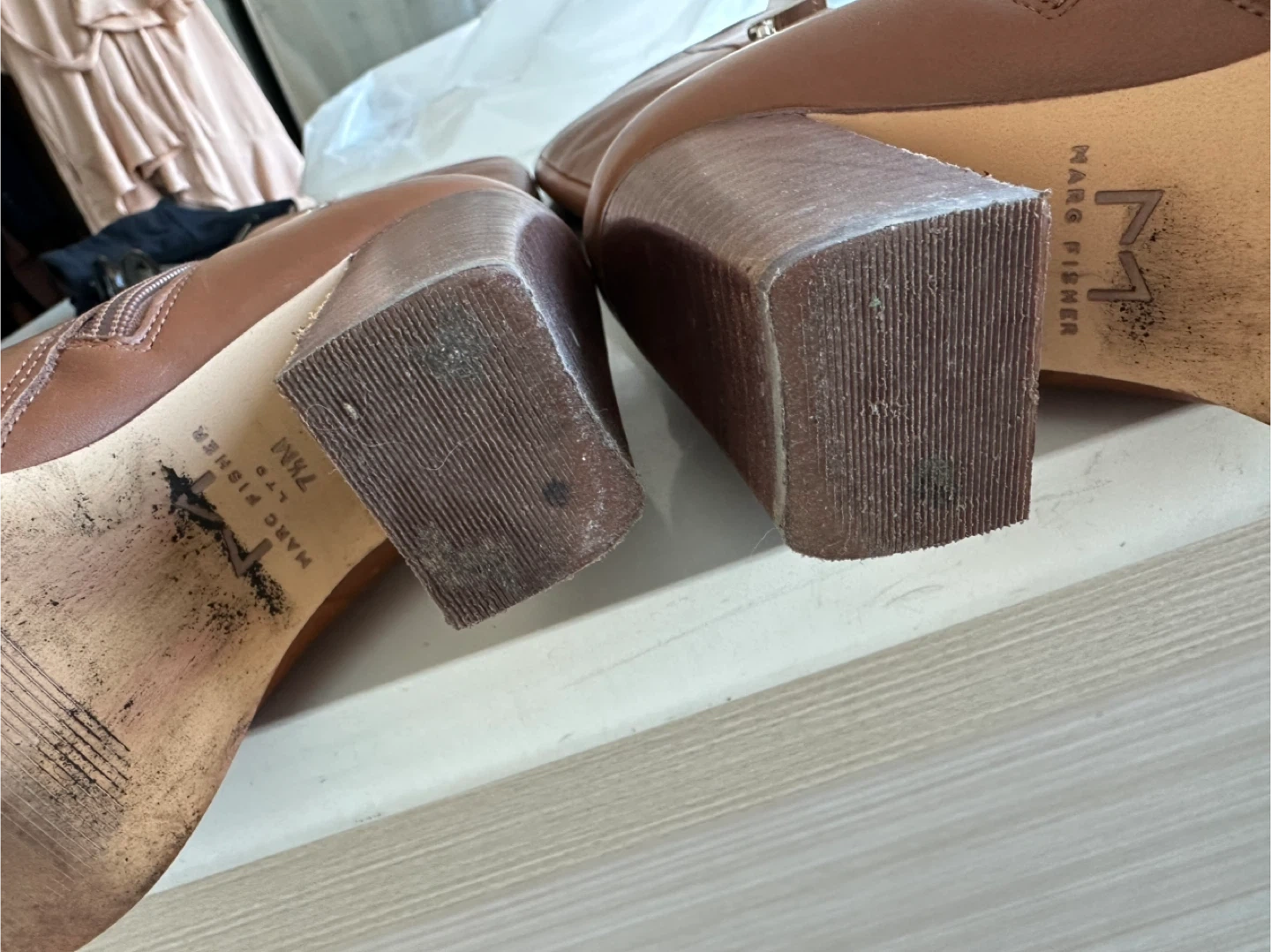 Classic brown leather knee-high boots from Marc Fisher LTD. These boots feature a stacked block heel and a pointed toe. Size 7.5M. Leather material. Zip closure on the inner side.