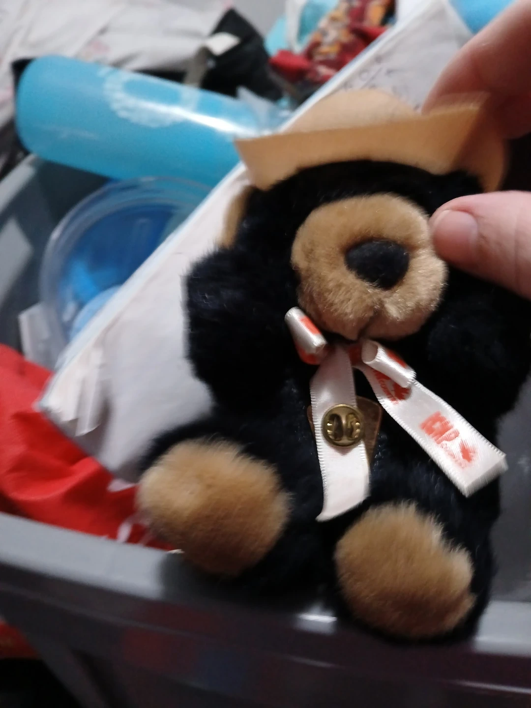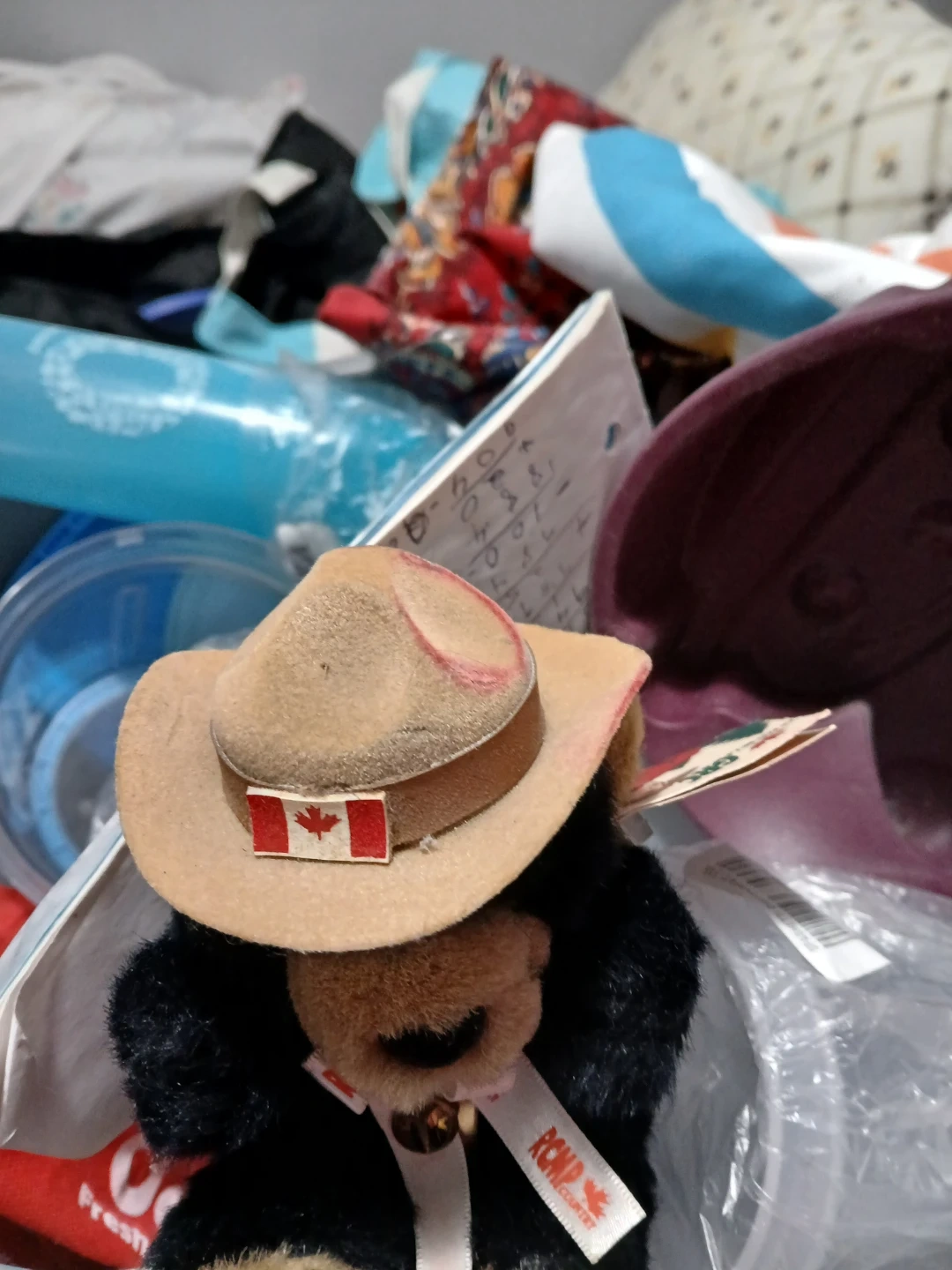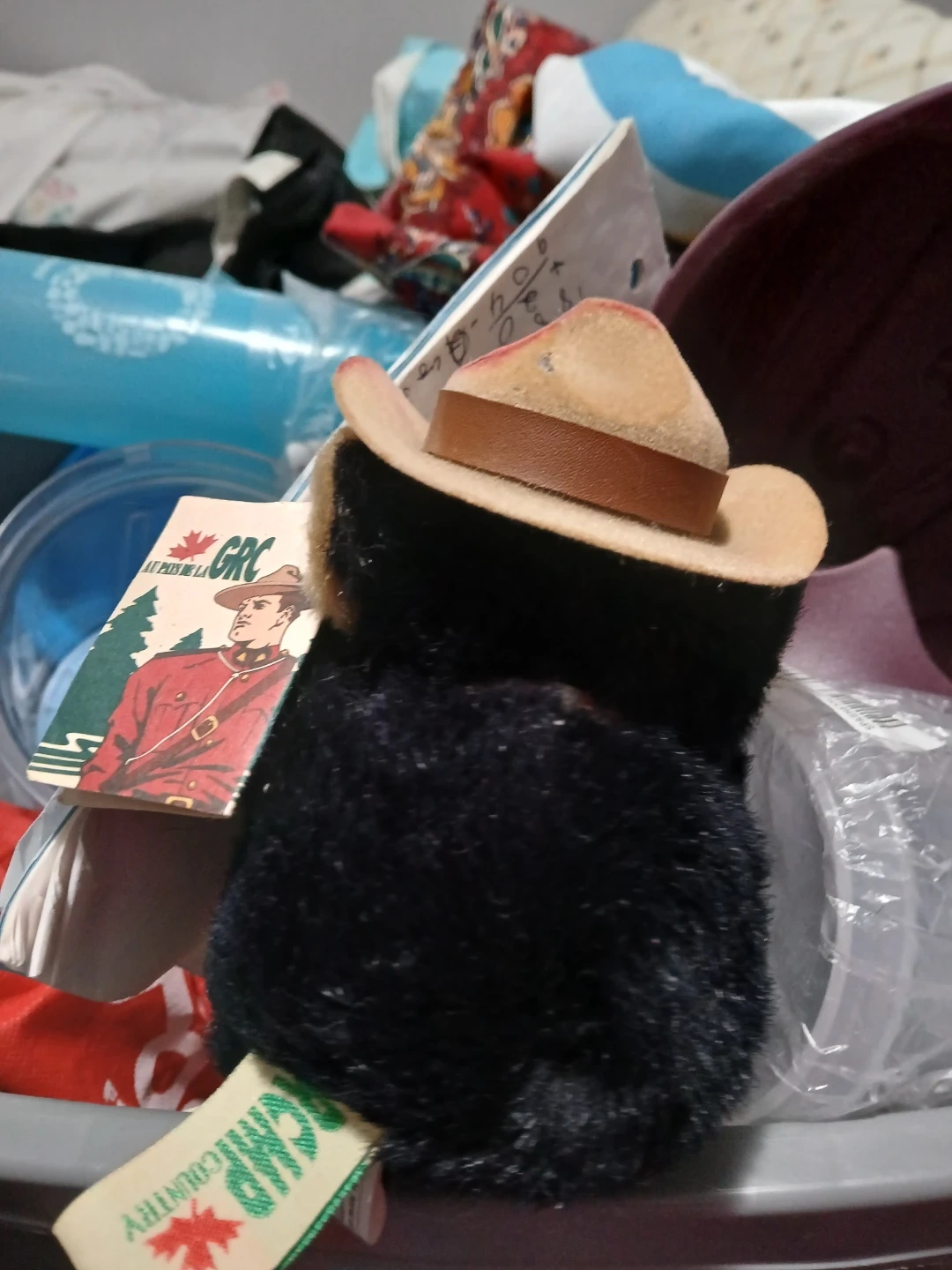 This is a plush teddy bear dressed in a hat and a ribbon with RCMP branding. It's a fun souvenir item. The bear is black with tan accents and wearing a cowboy-style hat.