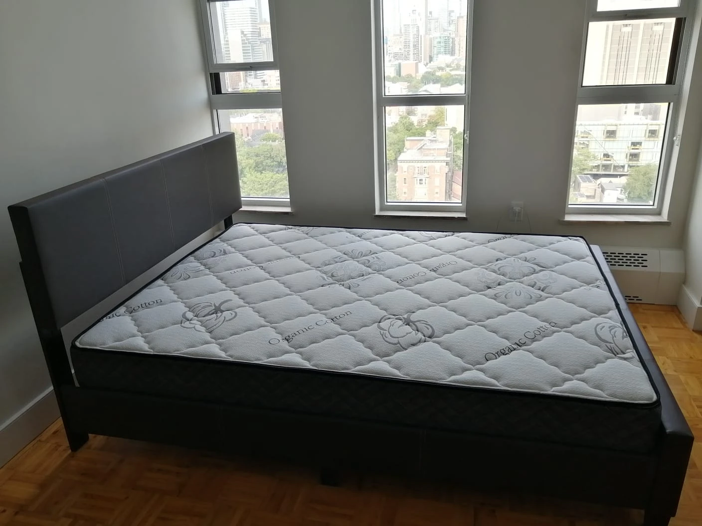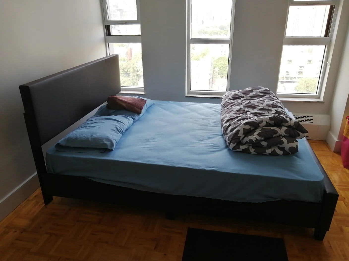 Queen size bed frame, dark brown faux leather headboard. Excellent condition.