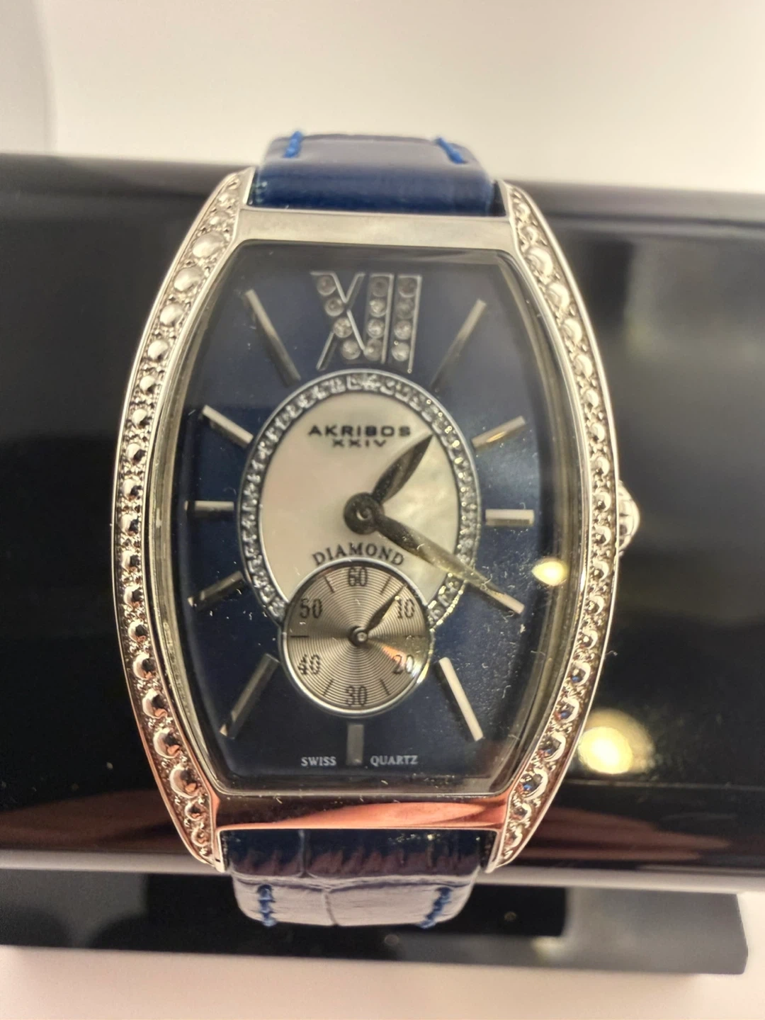 This Akribos XXIV watch features a blue dial with Roman numerals and a diamond accent. It has a genuine leather strap and is water-resistant up to 30 meters. It's powered by Swiss quartz movement.