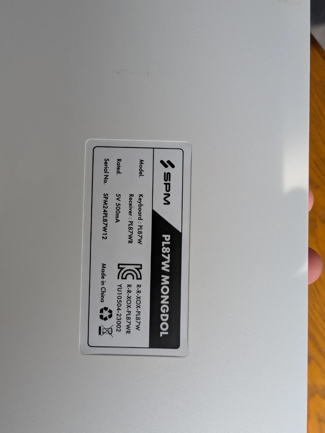 This is a white SPM PL87W MONGDOL wireless keyboard. It connects via a receiver. The keyboard model is PL87W and the receiver model is PL87WR. Made in China.