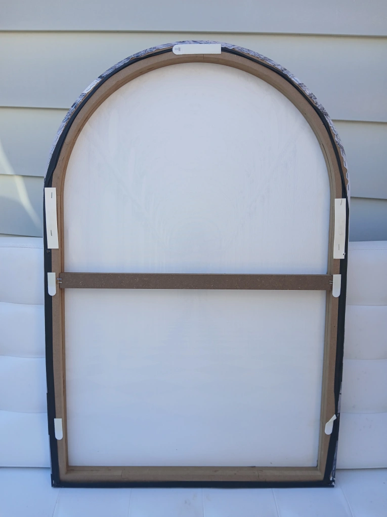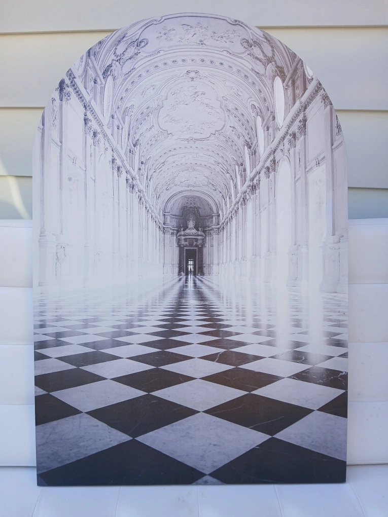 Here's a stylish arched canvas print, perfect for adding a touch of elegance to any room! The black and white hallway design creates a striking visual effect