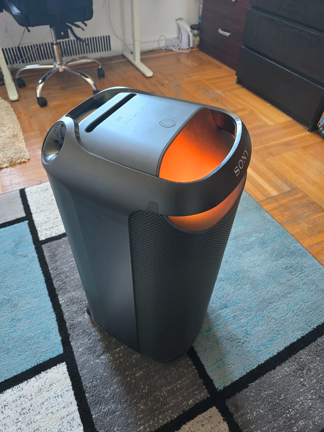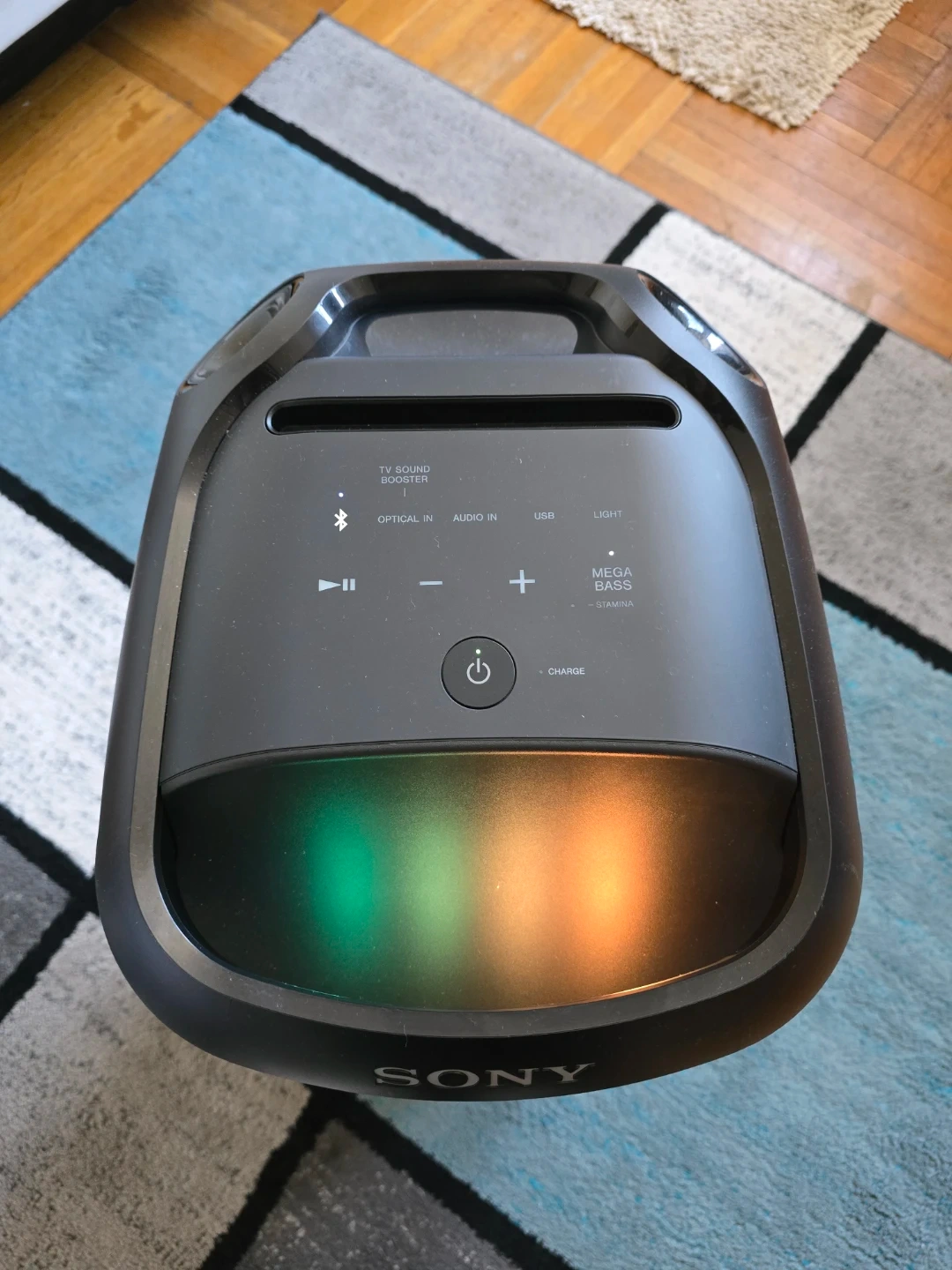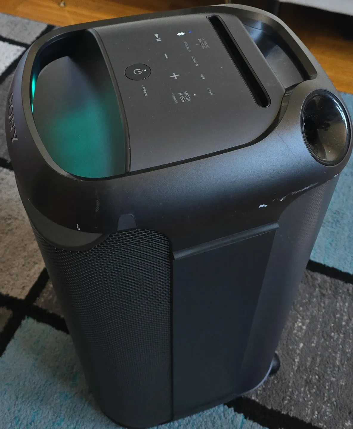 Selling a Sony SRS-XV800 party speaker. It features MEGA BASS for enhanced sound and has a TV SOUND BOOSTER function. It also has inputs for OPTICAL IN, AUDIO IN, and USB. There are some signs of wear.