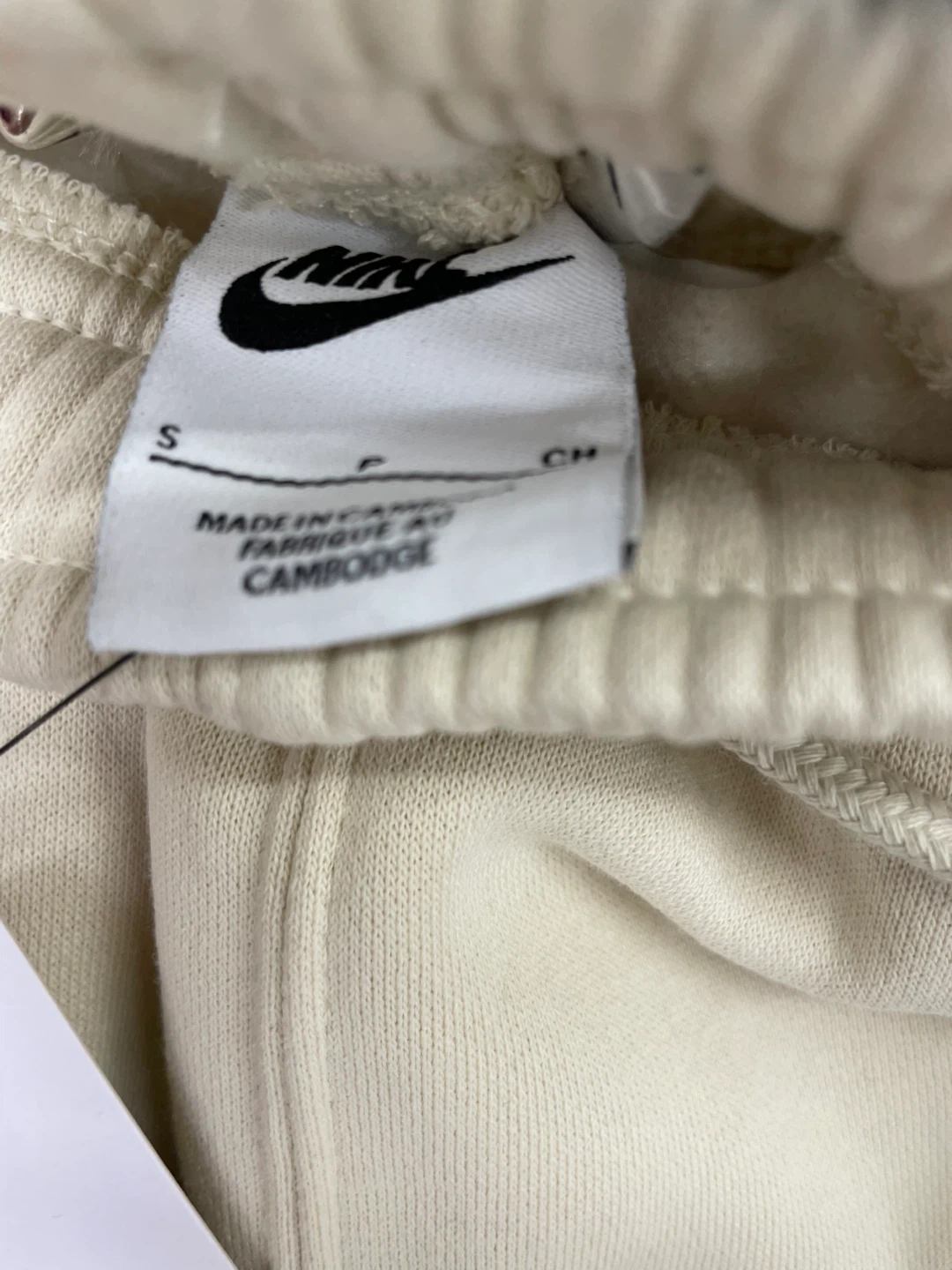 Cream-coloured Nike sweatpants with a textured embroidered swoosh logo. Made in Cambodia.