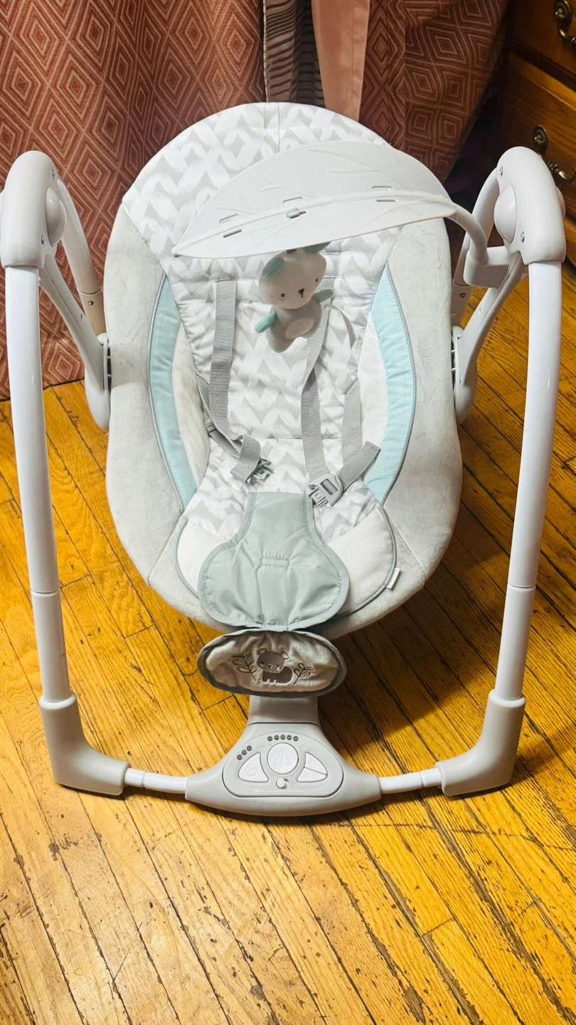 A baby swing, featuring a patterned fabric seat and a toy hanging above. It has an easily adjustable base and harness. You will find this item to be soothing for any baby.