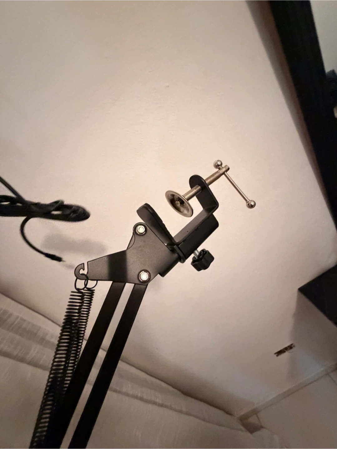 This adjustable microphone boom arm stand comes with a microphone. It's made of metal and plastic. The stand features a clamp for mounting to desks or tables. Great for recording or streaming!