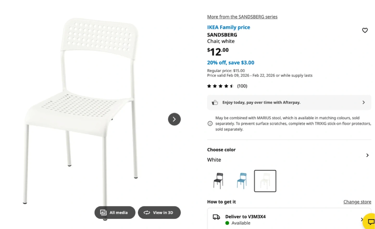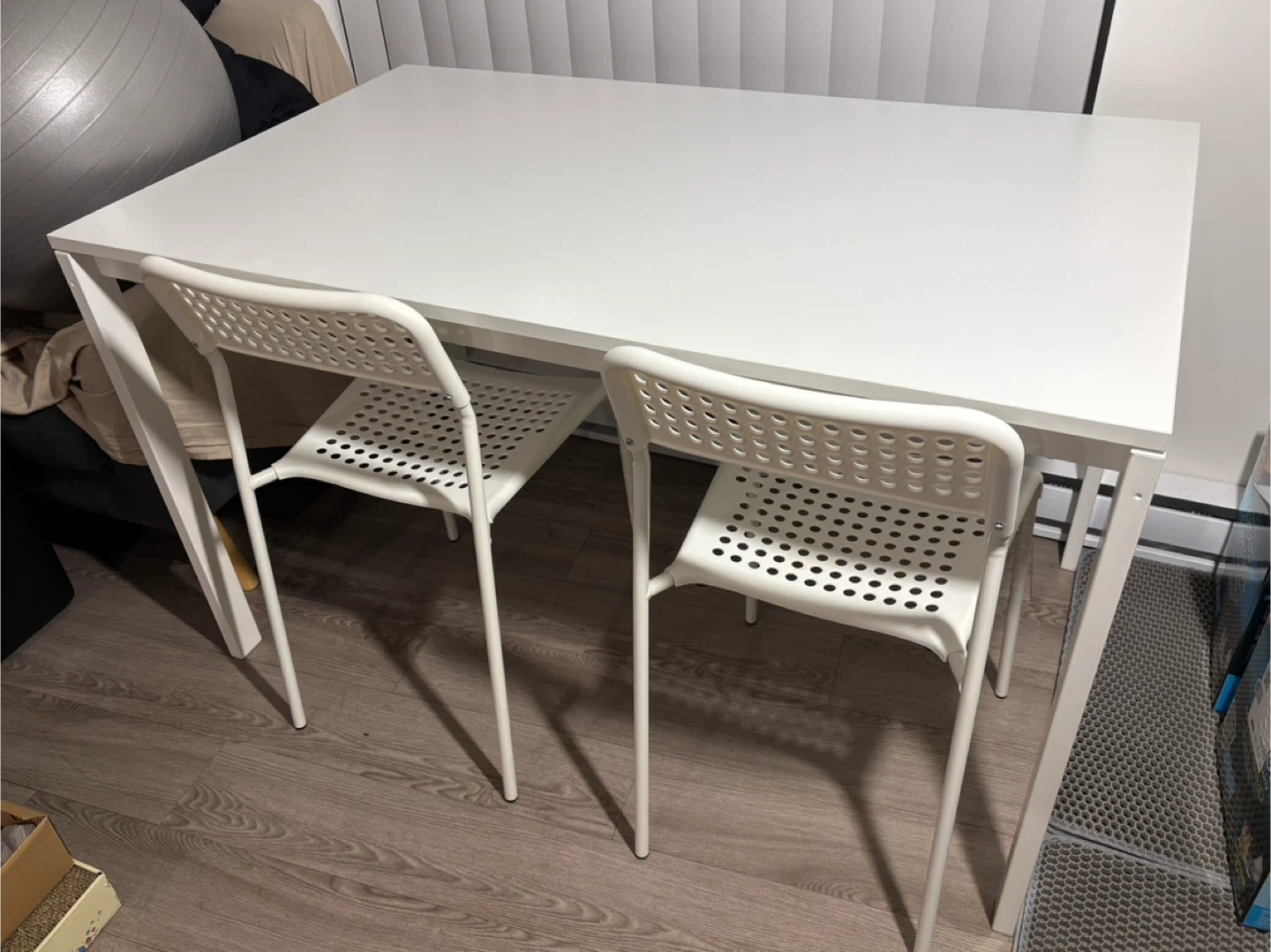 White extendable table with a metal frame, measuring 120/180cm long. Includes two white SANDSBJERG chairs with perforated seats. Great for small spaces or when you need extra seating!