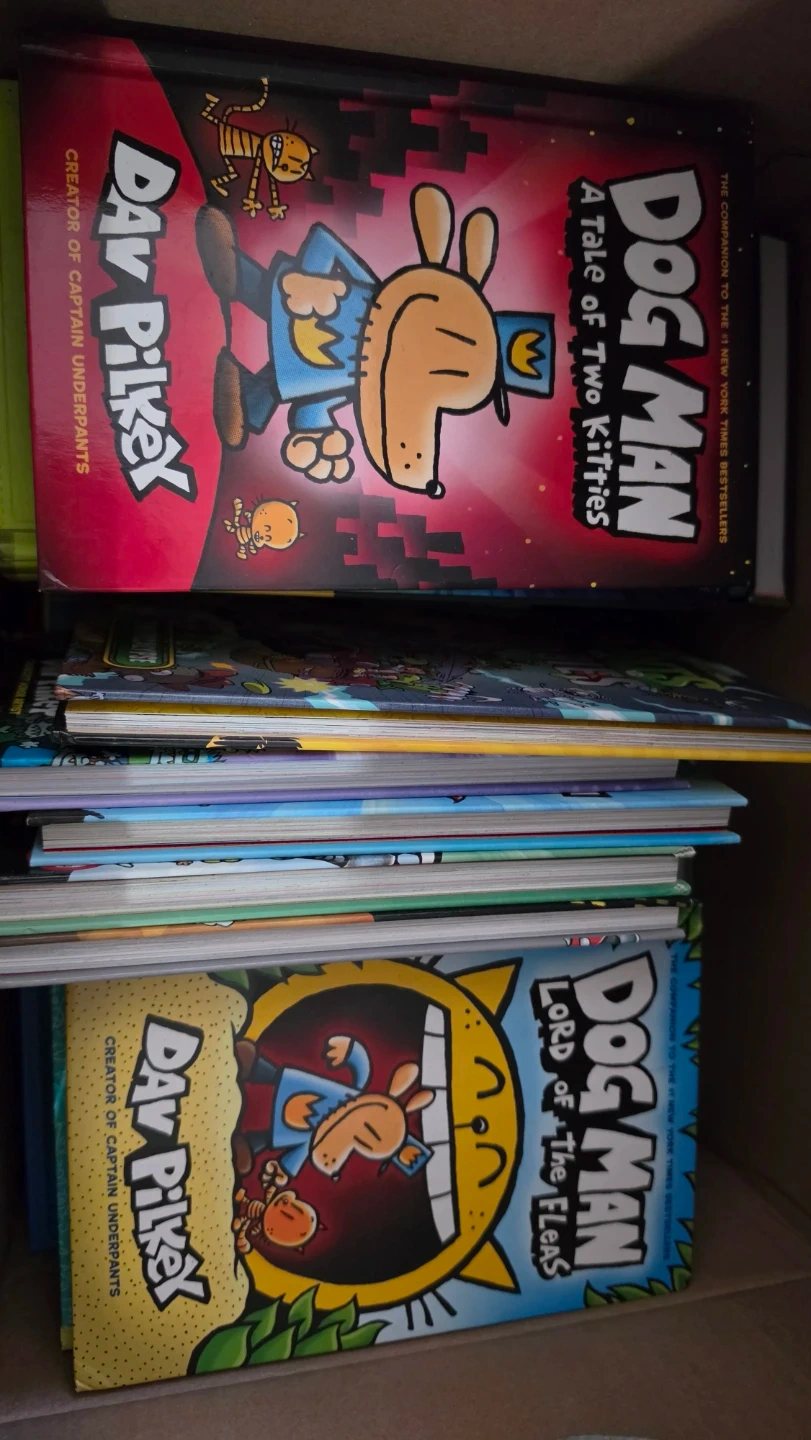 Collection of popular children's books including titles from the Dog Man series by Dav Pilkey and Diary of a Wimpy Kid by Jeff Kinney. Also includes Plants vs. Zombies books. Great for young readers!