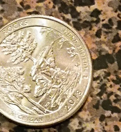 This is a 2018 Michigan State Quarter. It features the state's slogan 'Pure Michigan' and a depiction of the Pictured Rocks National Lakeshore. Made of a clad composition.