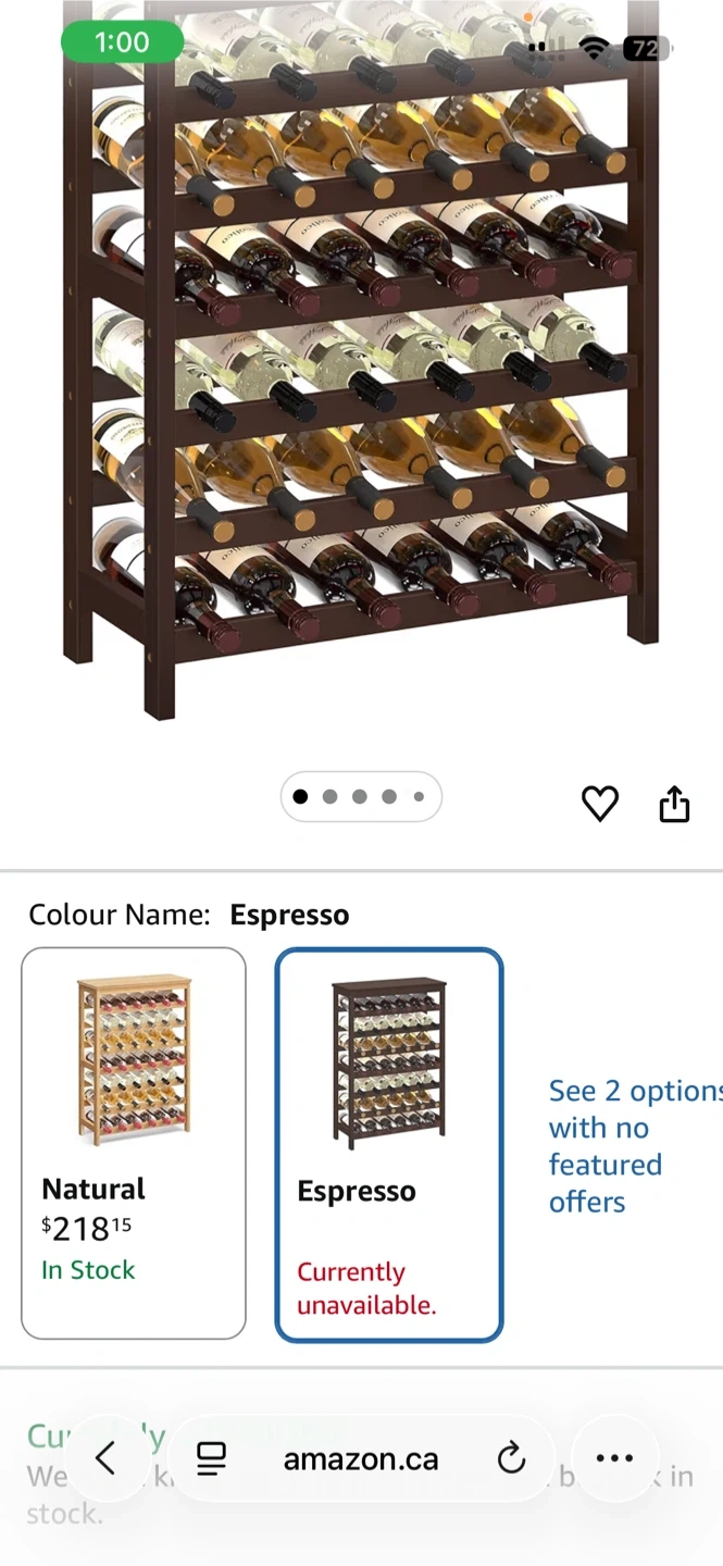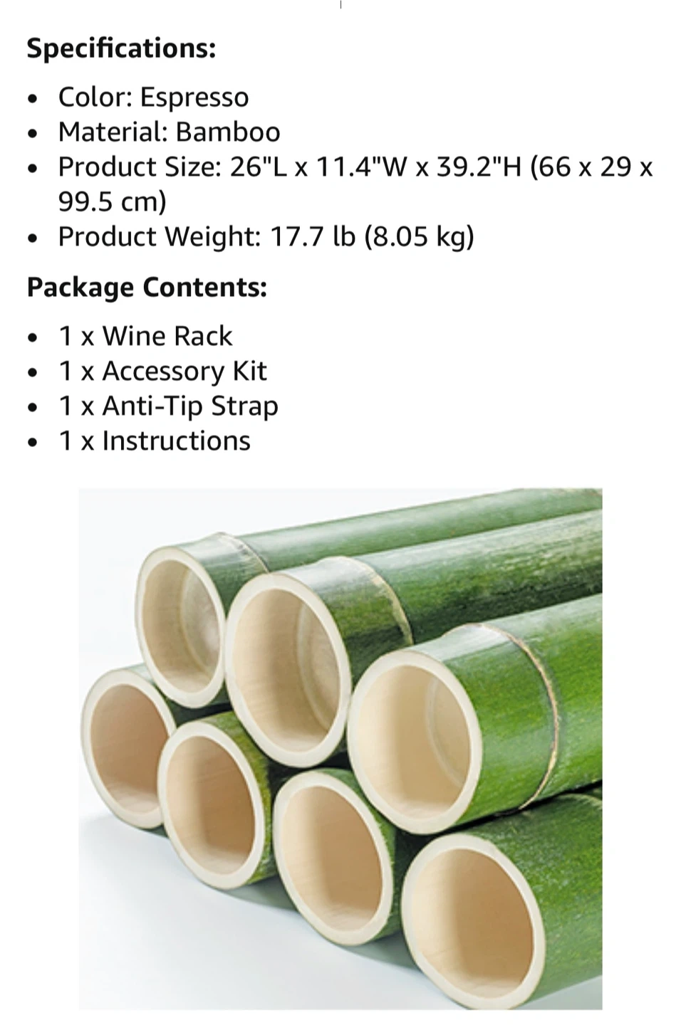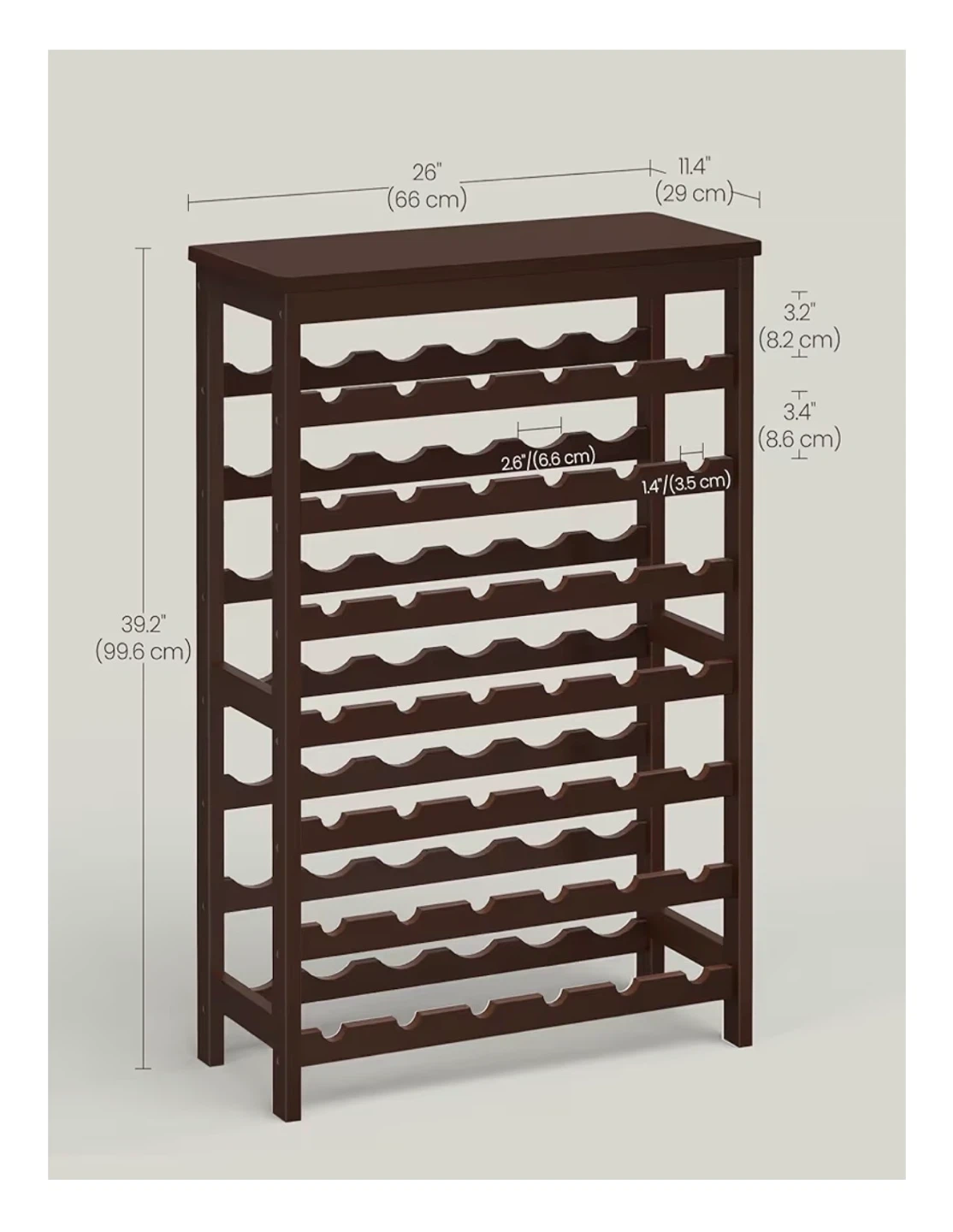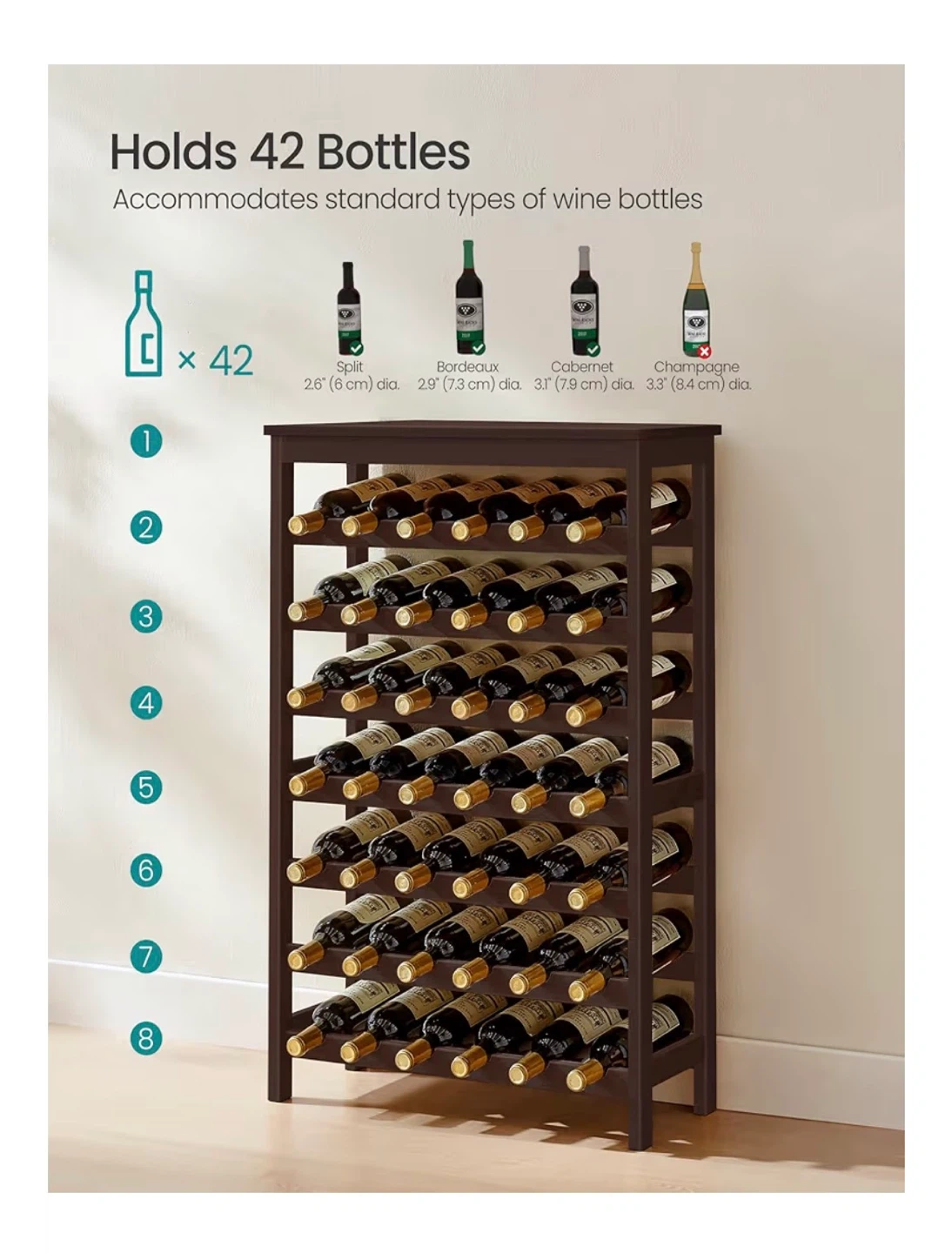 This SONGMICS wine rack holds up to 42 bottles. It's made of bamboo with an espresso finish. The product size is 26" L x 11.4" W x 39.2" H. It includes an anti-tip strap for safety.