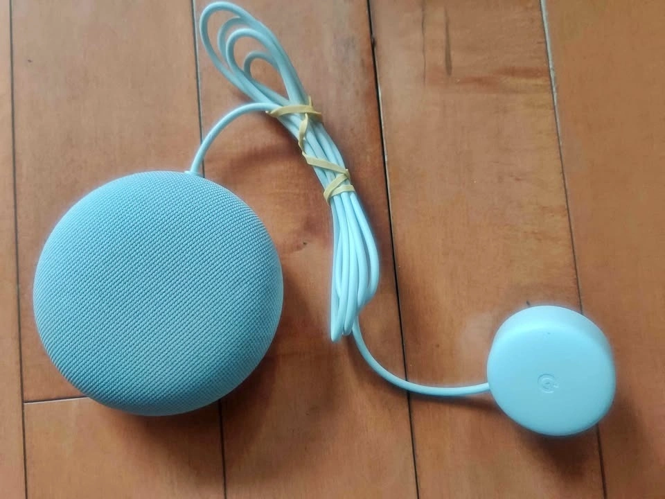 Google Nest Mini smart speaker in aqua blue. Comes with a power cord. Works great with Google Assistant for playing music and controlling smart home devices.