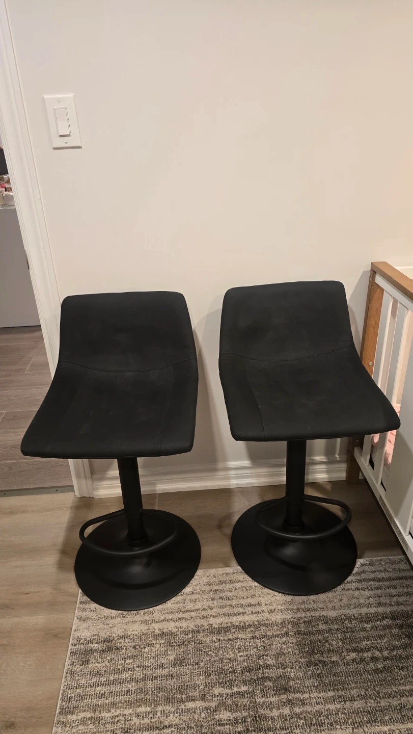 Selling a pair of black bar stools. They're adjustable in height and feature a comfortable upholstered seat. Perfect for a kitchen island or home bar!