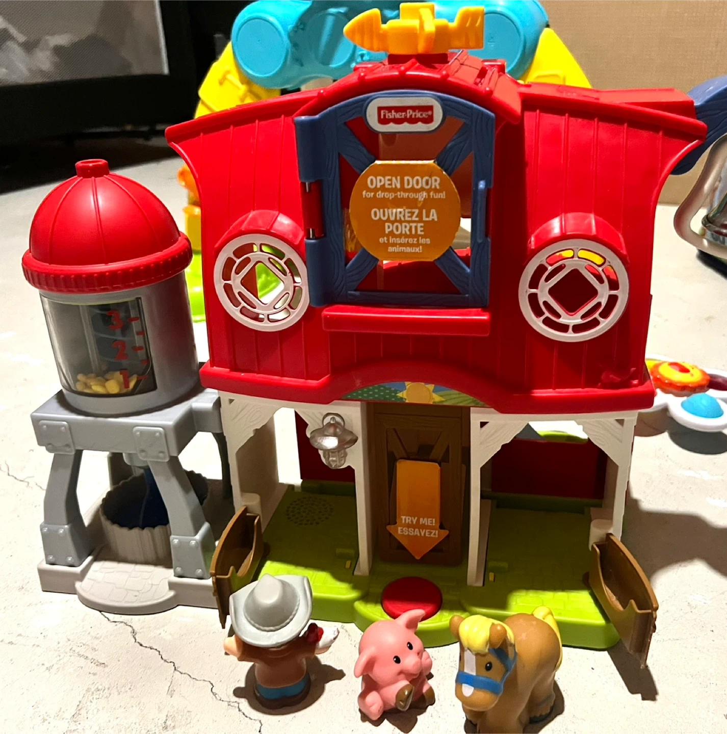 This Fisher-Price Little People farm playset comes with animal figures. It features an open door for drop-through fun and a 'Try Me!' button. Kids can play with the included farmer, pig, and horse figures only
