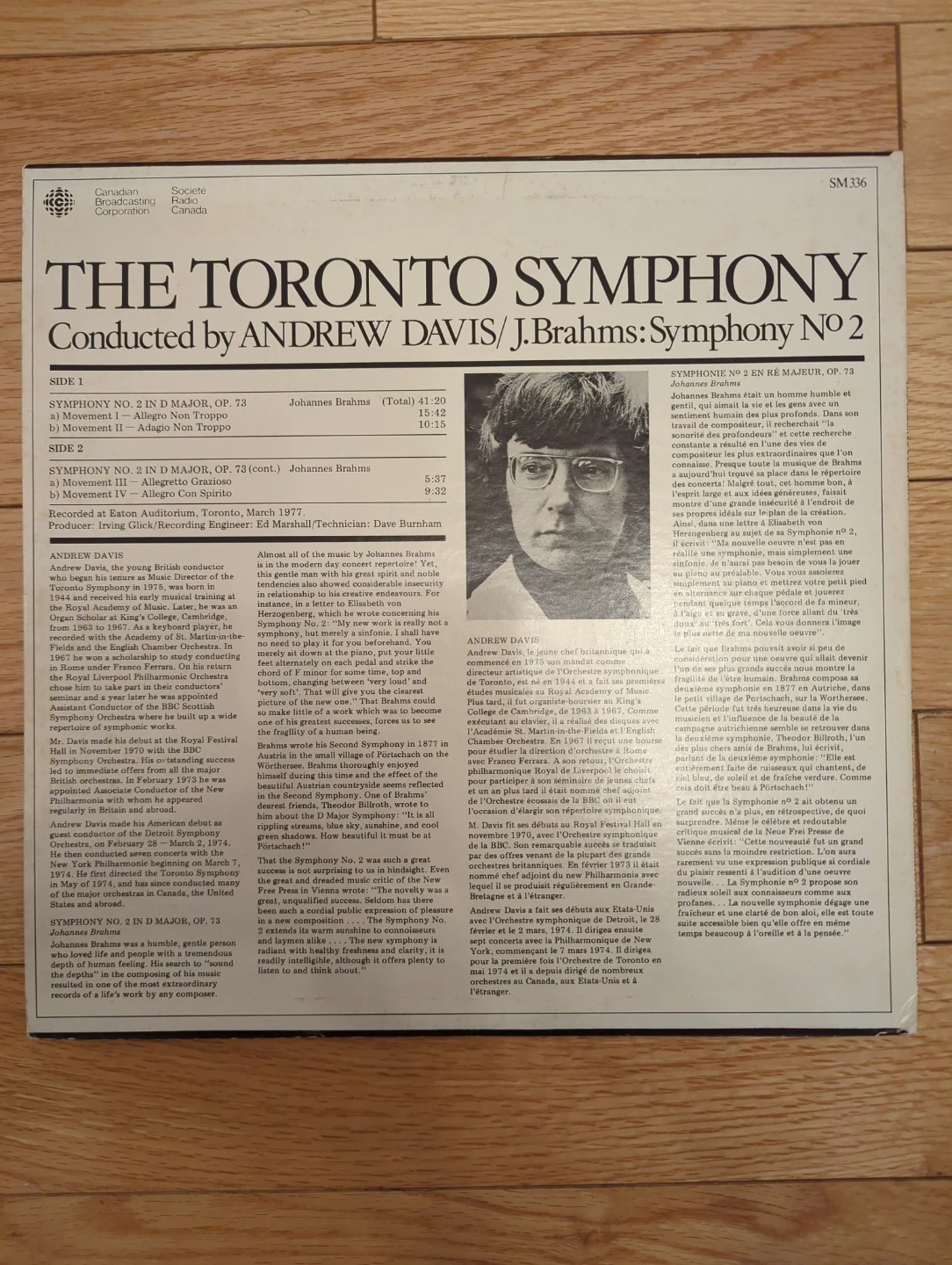 This is a vinyl record of The Toronto Symphony conducted by Andrew Davis, featuring J. Brahms' Symphony No 2. It includes Side 1 with Symphony No. 2 in D major, Op. 73: I. Allegro non troppo and II. Adagio non troppo. Side 2 has Symphony No. 2 in D major, Op. 73: III. Allegretto Grazioso and IV. Allegro con spirito. Recorded at Eaton Auditorium, Toronto, March 1977.
