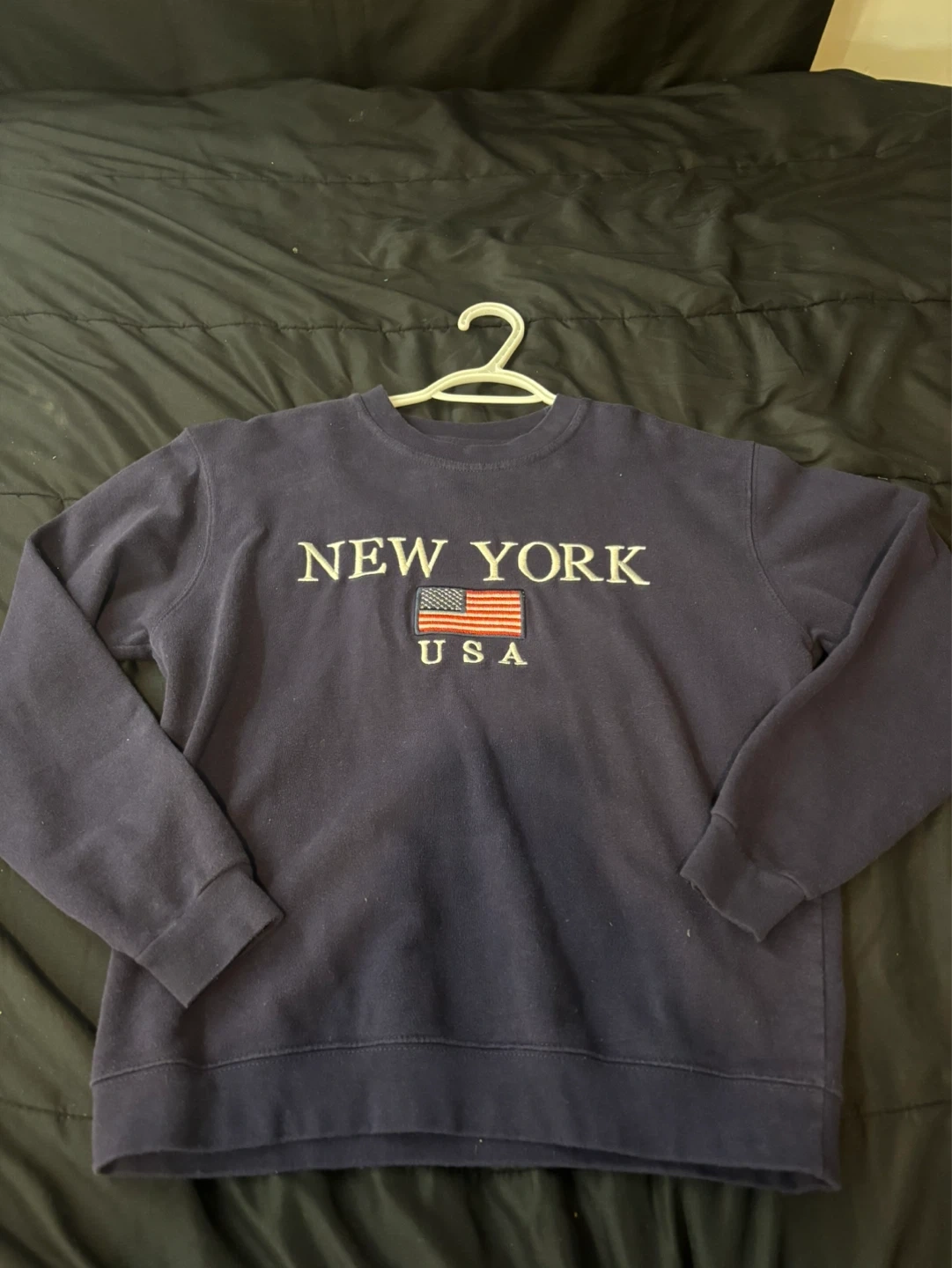 Navy blue sweatshirt with "New York USA" embroidered on the front, along with a small American flag graphic. It's a comfy pullover style. This sweatshirt would be nice for casual wear.