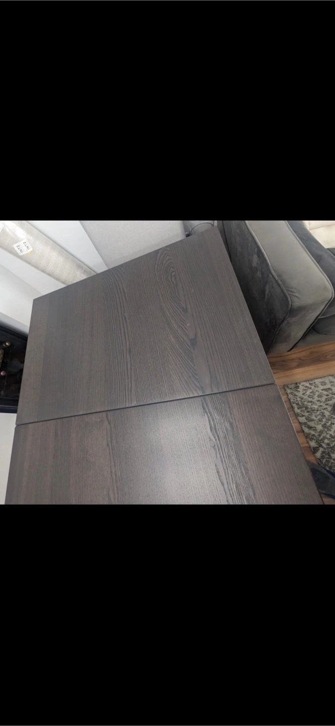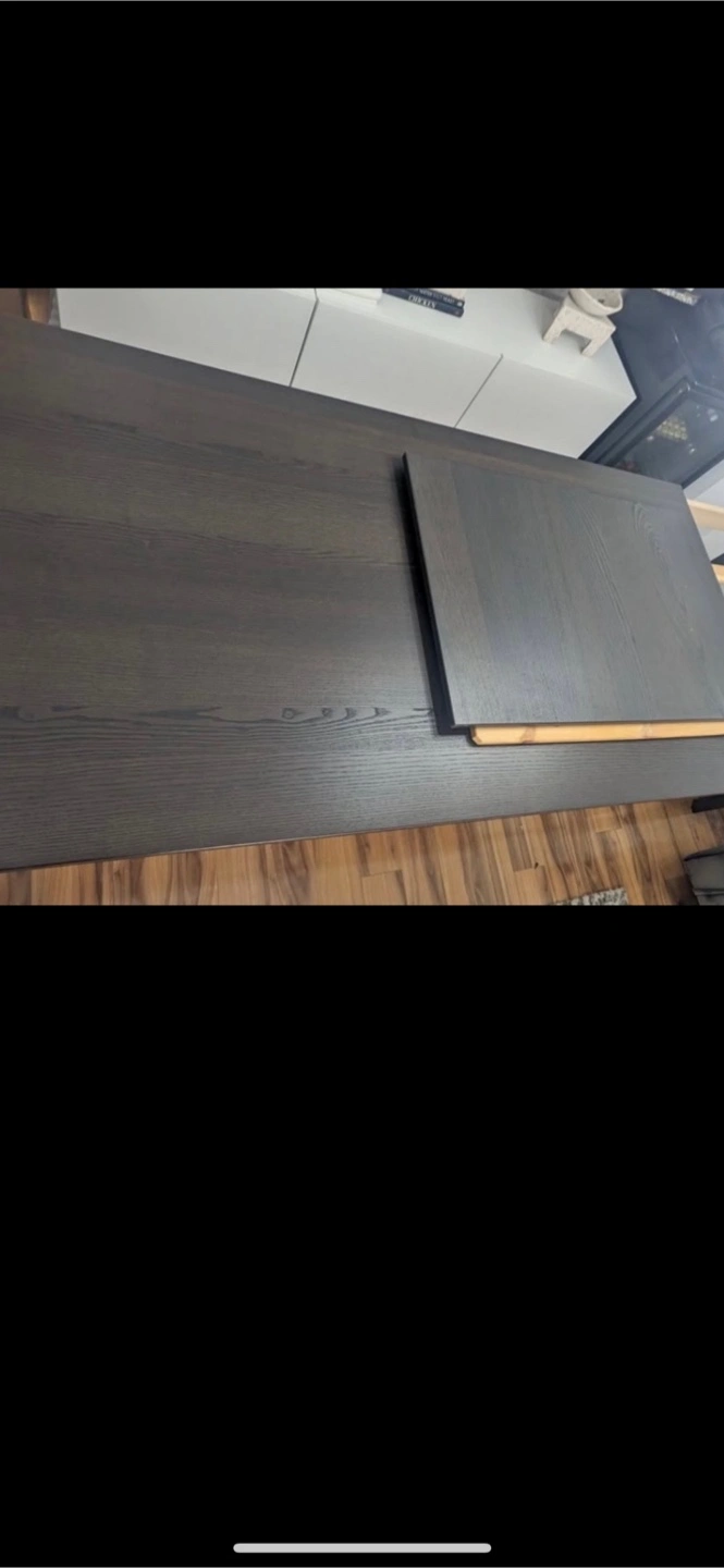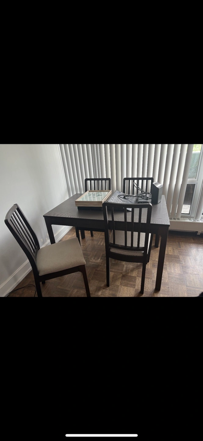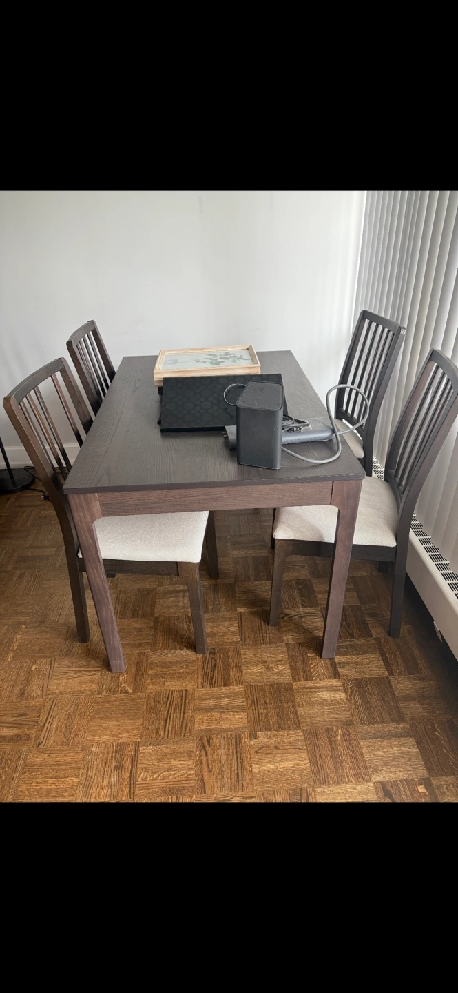 Selling a dining table set that includes a dark brown extendable table and four matching chairs. The table has an extension mechanism underneath, making it easy to accommodate more guests. The chairs have neutral-coloured upholstered seats.