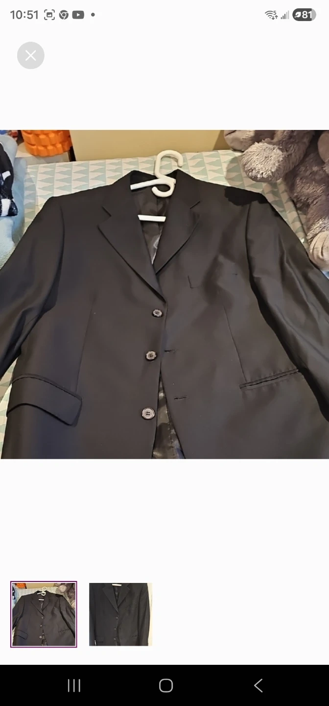 A classic black blazer for men. It's a versatile piece suitable for formal occasions or a smart casual look. This blazer has a notched lapel and three-button closure.