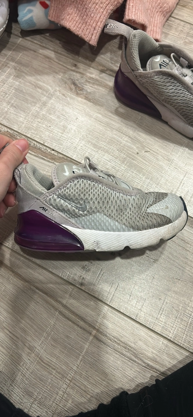 Pair of toddler Nike Air Max 270 shoes. Size 7.5. Grey and purple colourway. Gently used.