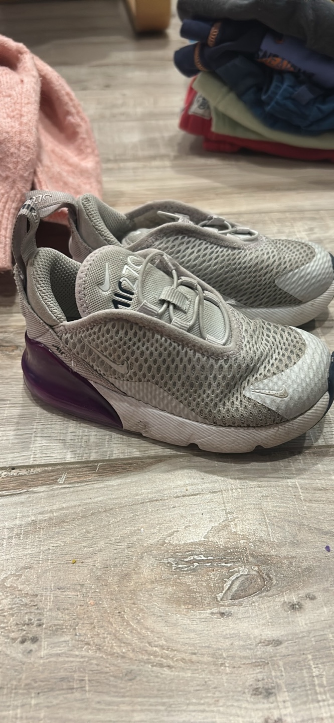 Pair of toddler Nike Air Max 270 shoes. Size 7.5. Grey and purple colourway. Gently used.