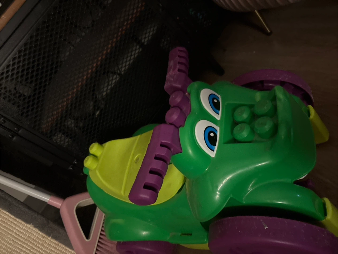 This fun green alligator ride-on toy is perfect for little ones. It features colourful purple wheels and yellow accents. Made of durable plastic, it's built for playtime adventures. A great way for toddlers to develop coordination!