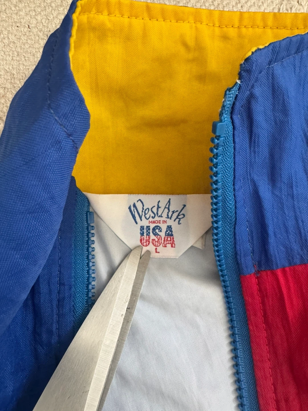 This color block jacket by WestArk. Made in the USA. Features a 1997 graphic on the chest.