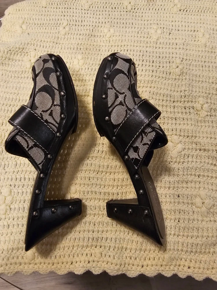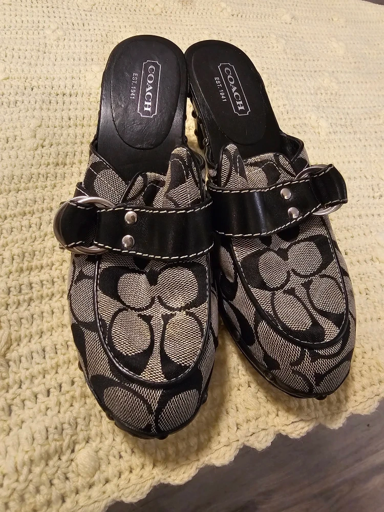 Selling a pair of Coach mules in size 8 n a Half. They have a black and grey signature print with a black leather buckle detail. These are super cute and in great condition!
