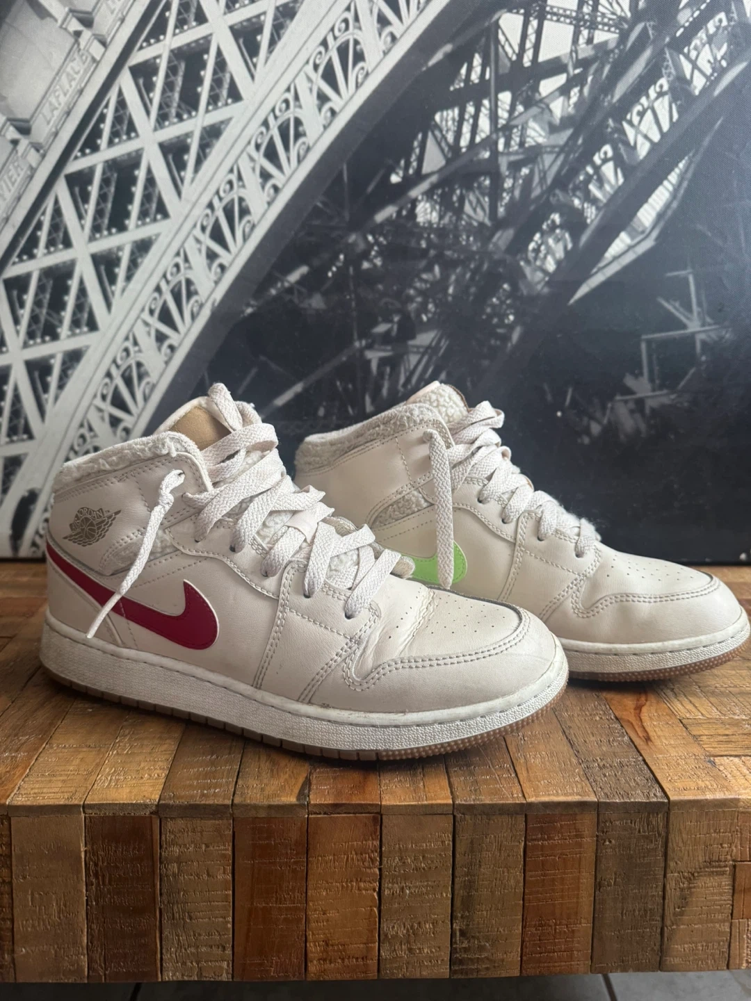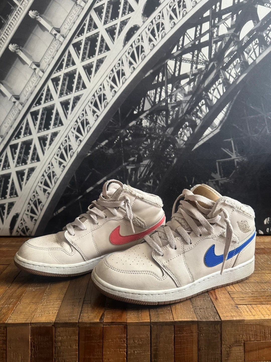 Air Jordan 1 Mid SE sneakers with a beige leather upper and various coloured Swooshes. These kicks feature a comfortable mid-top design and come with laces. Perfect for anyone looking to add a classic sneaker to their collection!