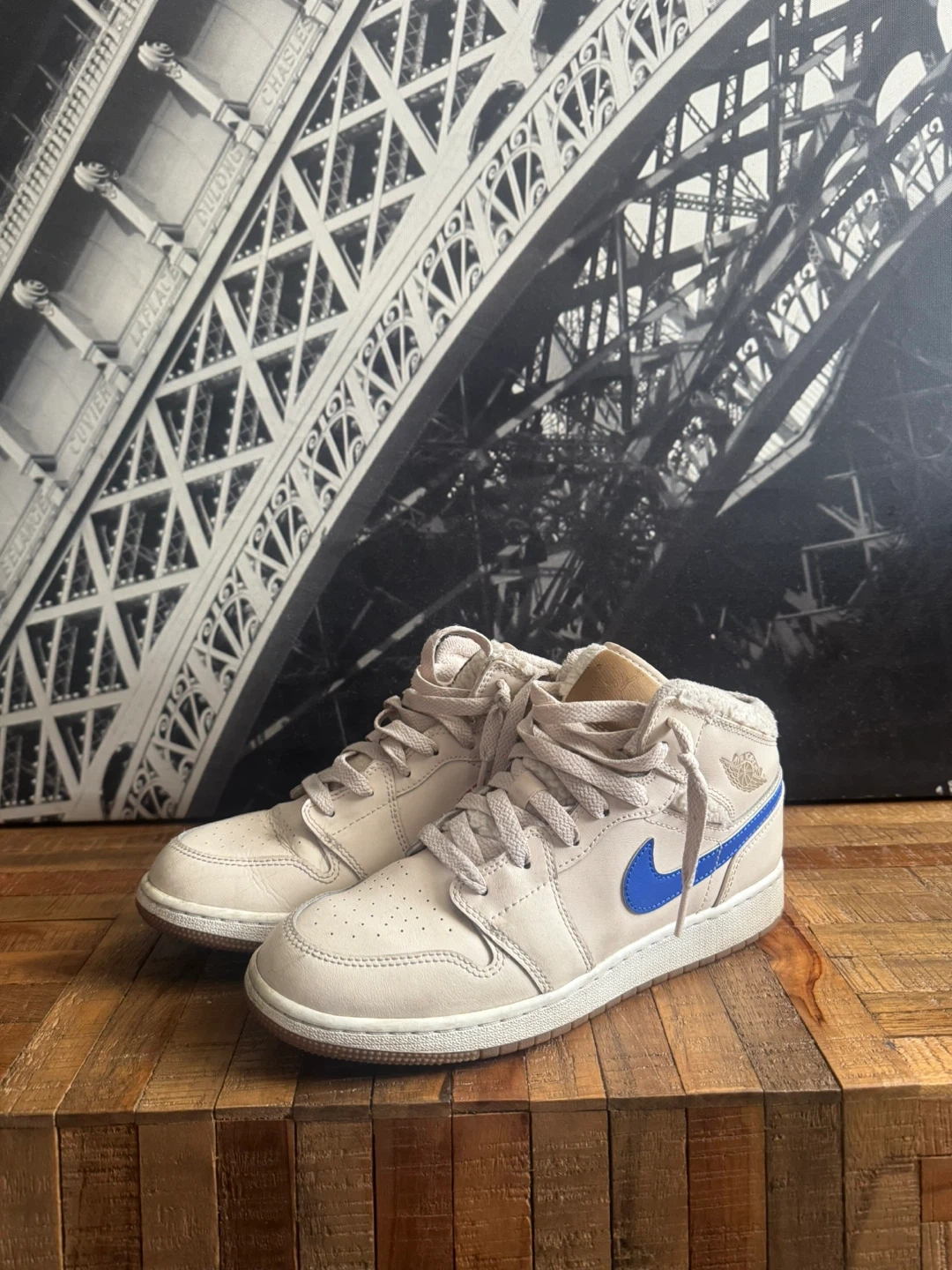 Air Jordan 1 Mid SE sneakers with a beige leather upper and various coloured Swooshes. These kicks feature a comfortable mid-top design and come with laces. Perfect for anyone looking to add a classic sneaker to their collection!