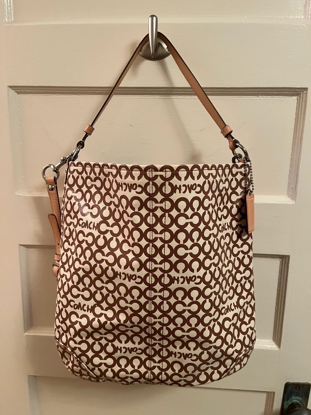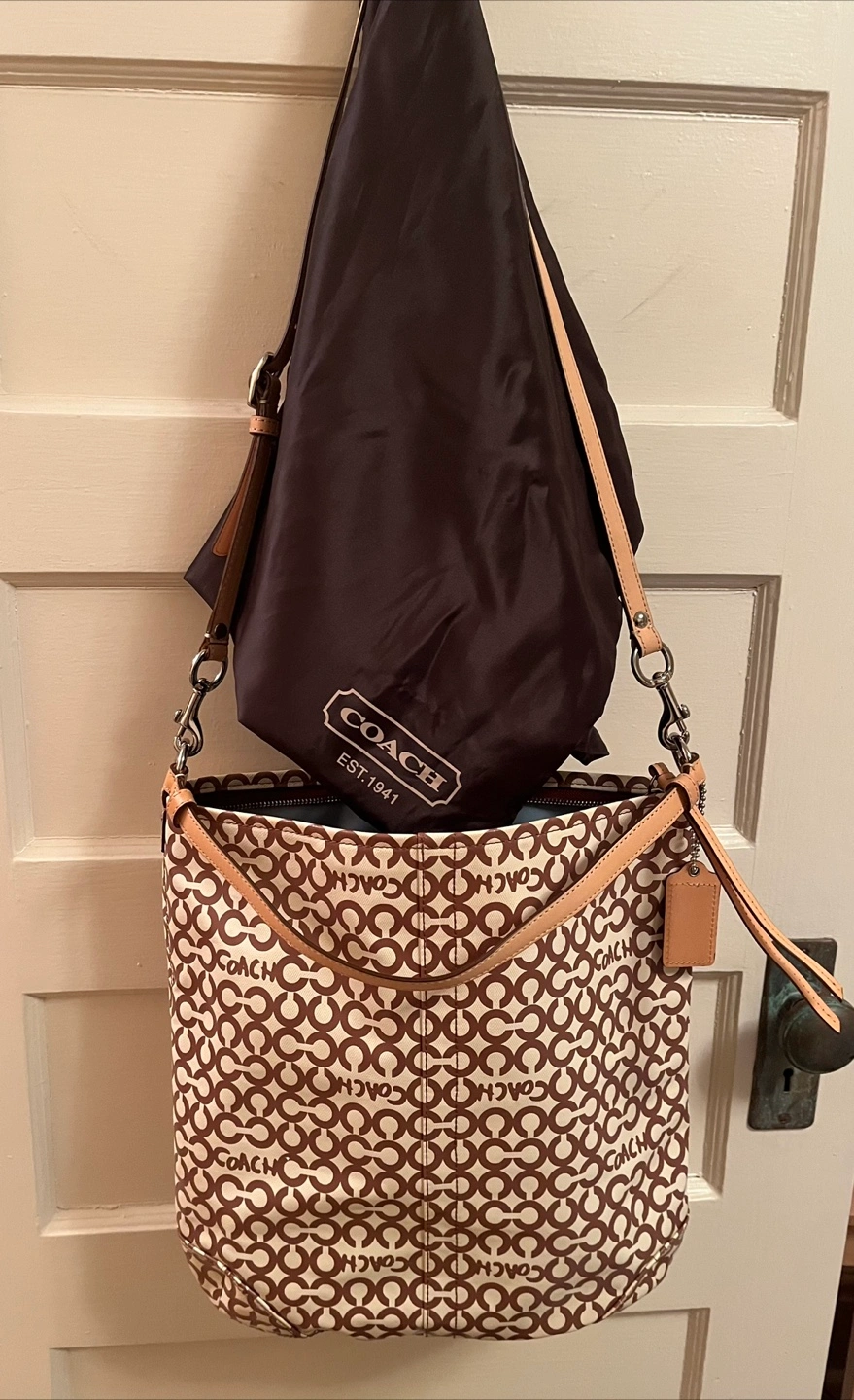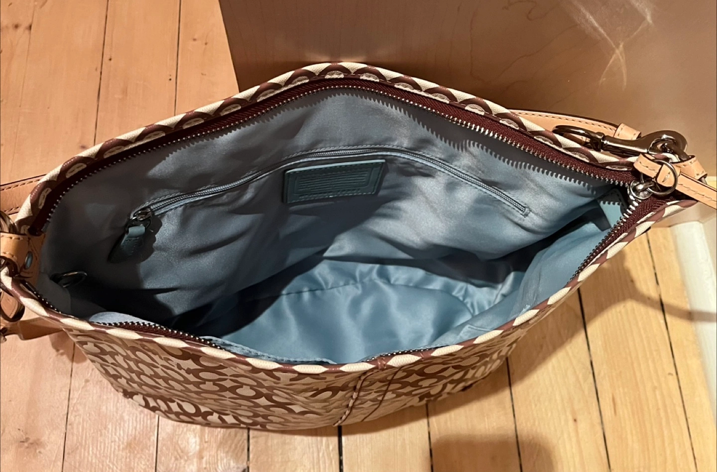 Selling a Coach hobo bag with the signature 'C' print. It's in great condition and comes with a dust bag to keep it protected when not in use. The interior is a lovely light blue colour. Perfect for everyday use!