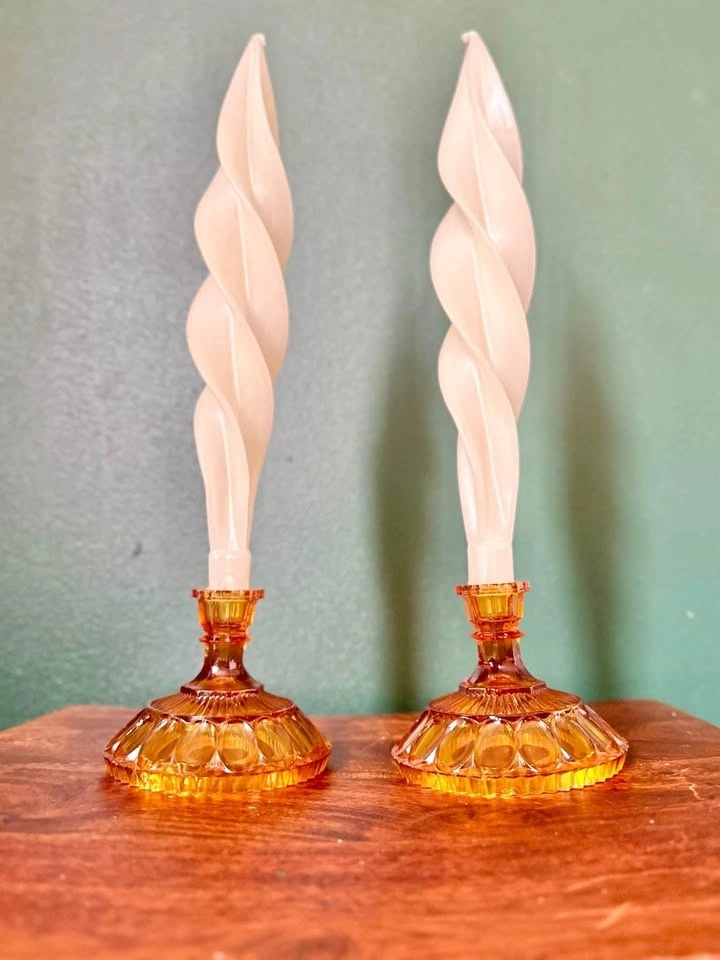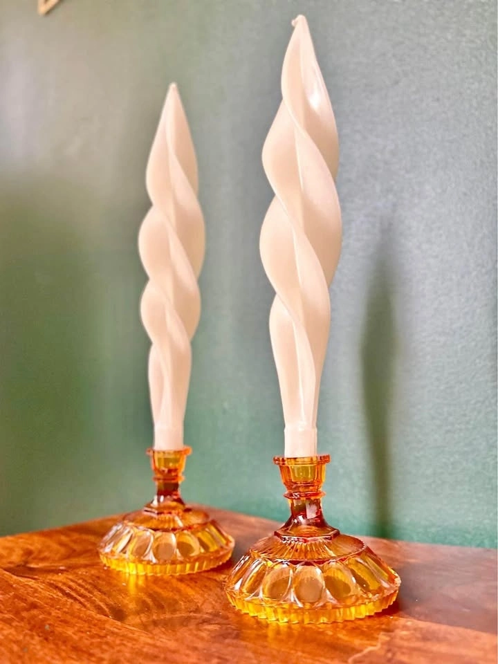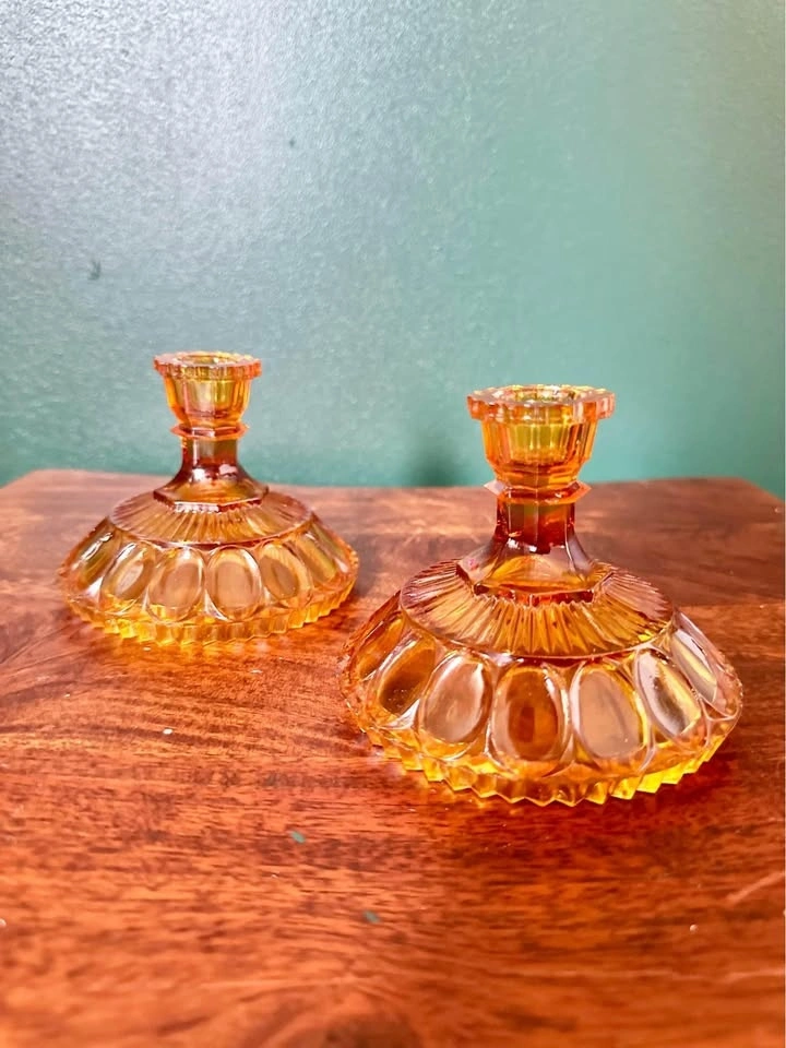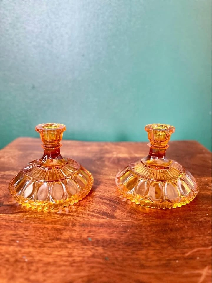 These candlestick holders are in excellent vintage condition. No chips or damage to note. Candlesticks are also for sale (see other listings), but please note that they do not safely fit these particular candlestick holders. 4.25”W x 3.5”H. Holder Capacity: 0.75”W.