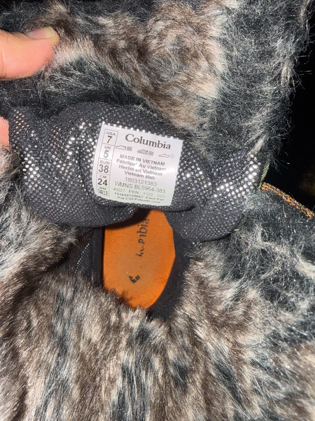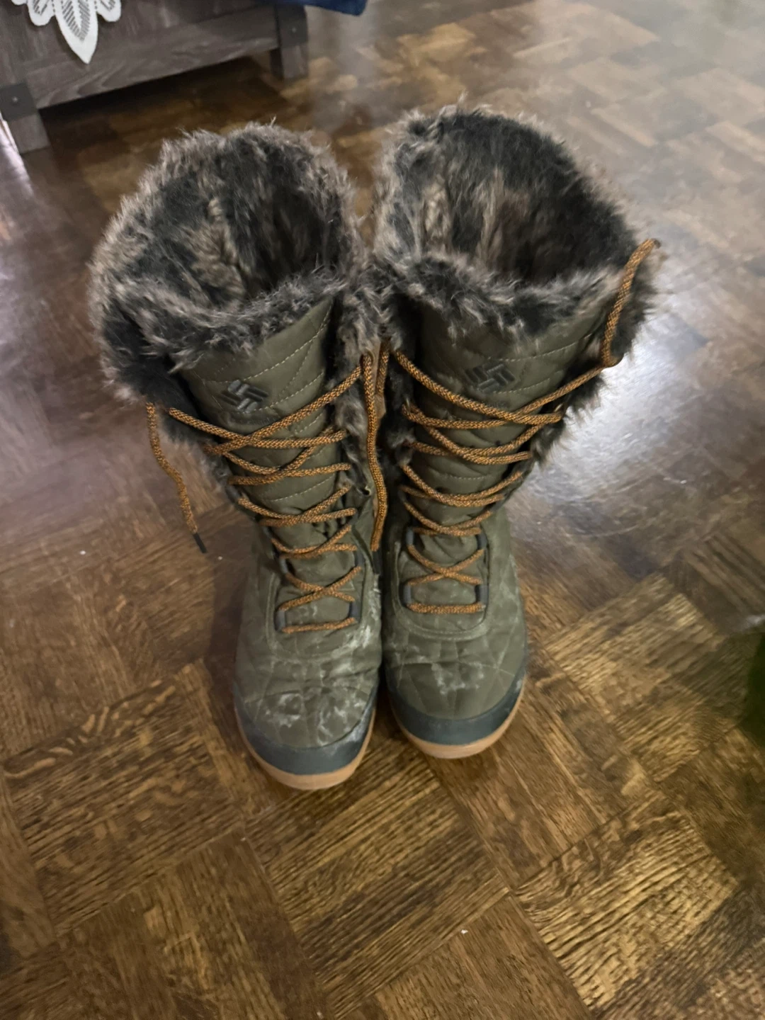 Columbia women's insulated winter boots in a size 7. These boots are designed for cold weather with a fuzzy trim. They feature lace-up closures for a secure fit. Made in Vietnam.