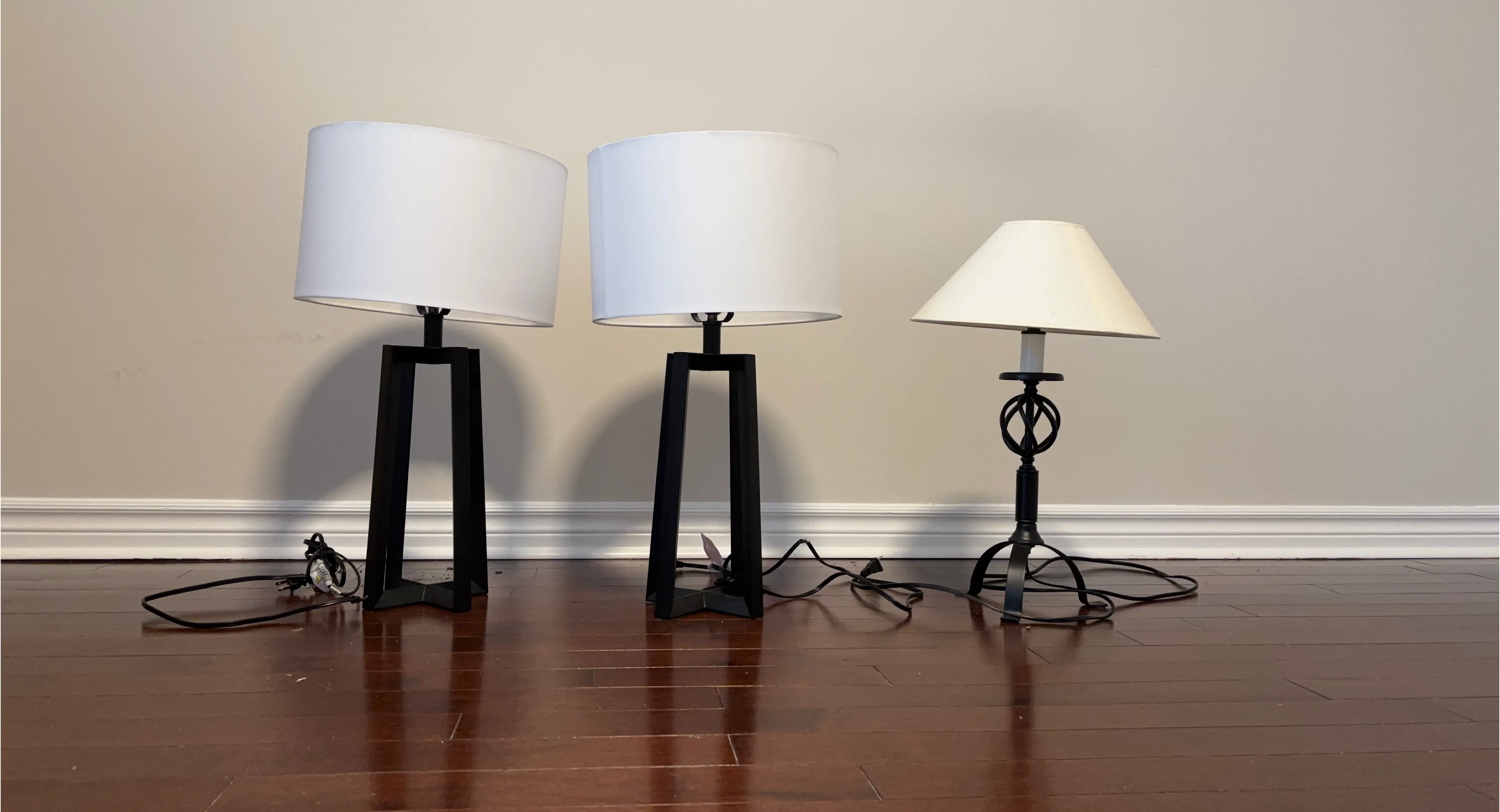This set includes three table lamps with black metal bases and white fabric shades. Two lamps have a modern, rectangular base design, while the third has a decorative, twisted metal base. All lamps come with their power cords and plugs. They're ready to add some light to your space!