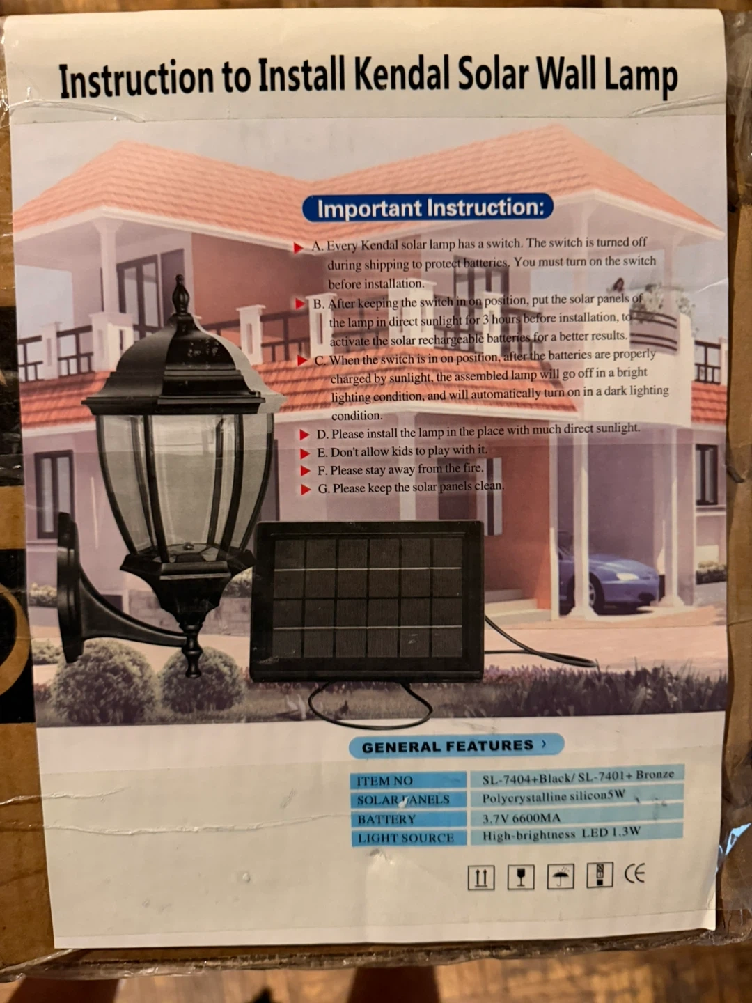 Brand new Kendal Solar Wall Lamp in bronze. It features a polycrystalline silicon solar panel and a high-brightness LED light source. This lamp is designed for outdoor use, providing illumination after dark. Comes with a on/off switch as well
