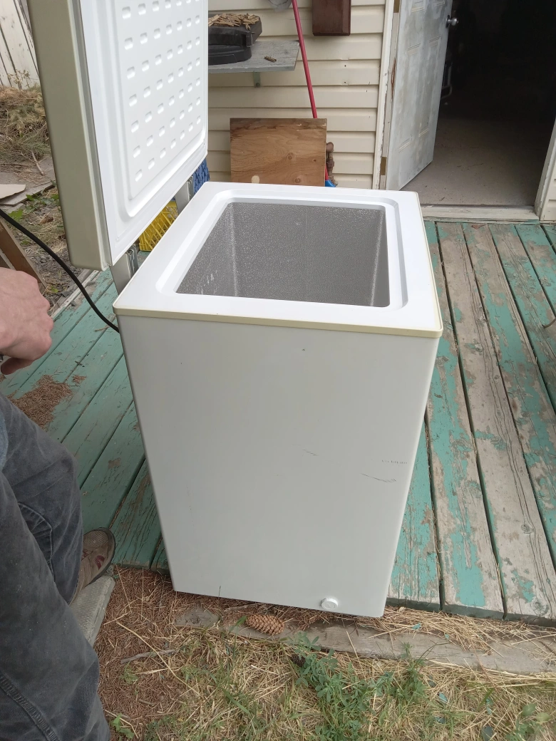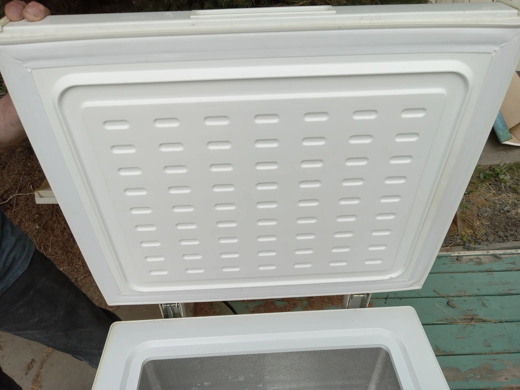White chest freezer in good condition. It has a small dent on the top. It has been cleaned.