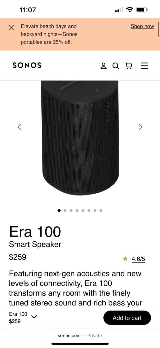 Buy & SellSonos Era 100 Smart SpeakerSonos Era 100 Smart Speaker$192A smart speaker, comes in its original packaging. It could bring you a sense of calm to your home.ConditionNewBrandSonosWHERE TO MEETVaughan MillsView MapSELLERAnnaConcord674 reviews0 chats·0 favorites·21 viewsSEND CHAT TO SELLERHi Anna! I’m interested in your listing.Hi Anna! I’m interested in your listing.Get the Karrot app to chatSign In to chat