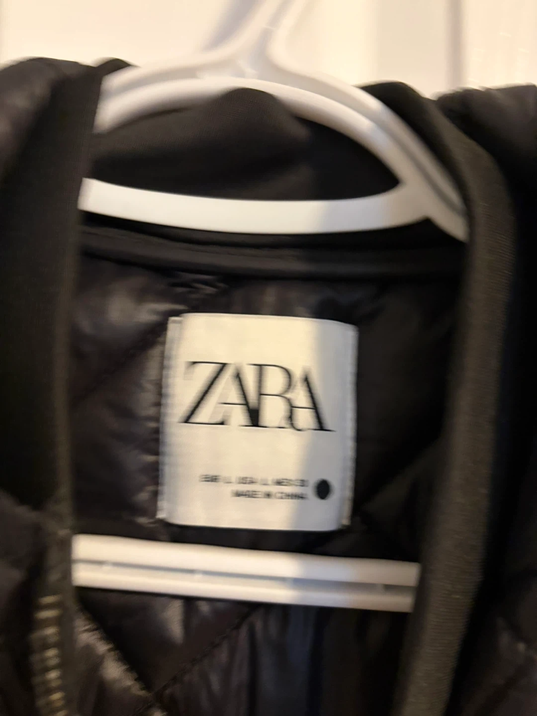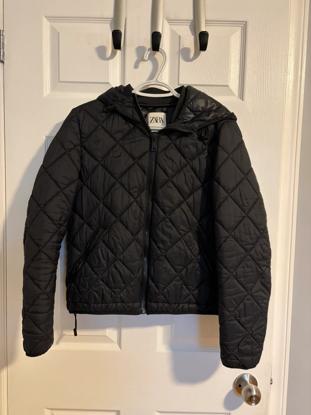 Black quilted bomber jacket with a hood from Zara. It features a full zip closure and zippered pockets. This jacket is a size L.