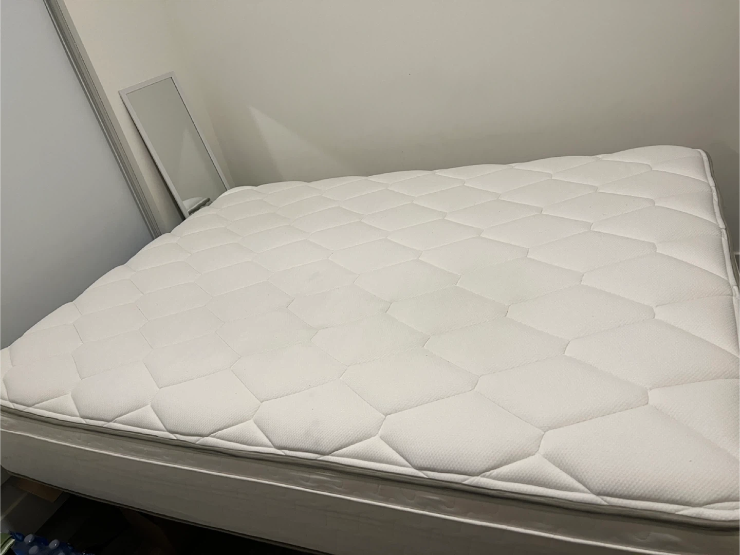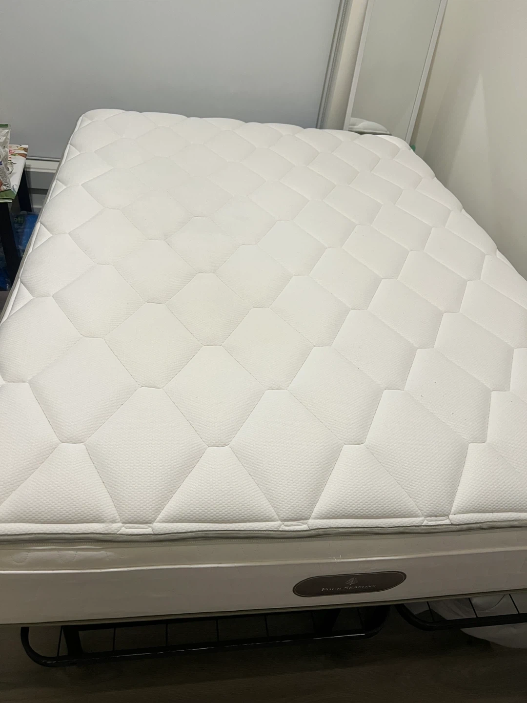 This is a Four Seasons mattress with a 12" thickness. It features a comfortable quilted top. It's suitable for a standard bed frame. Always had fully covered mattress protector on it. We bought it for over 2000$. Medium firm mattress. I can deliver for extra charge. No stains. Smoke free and pet free home.